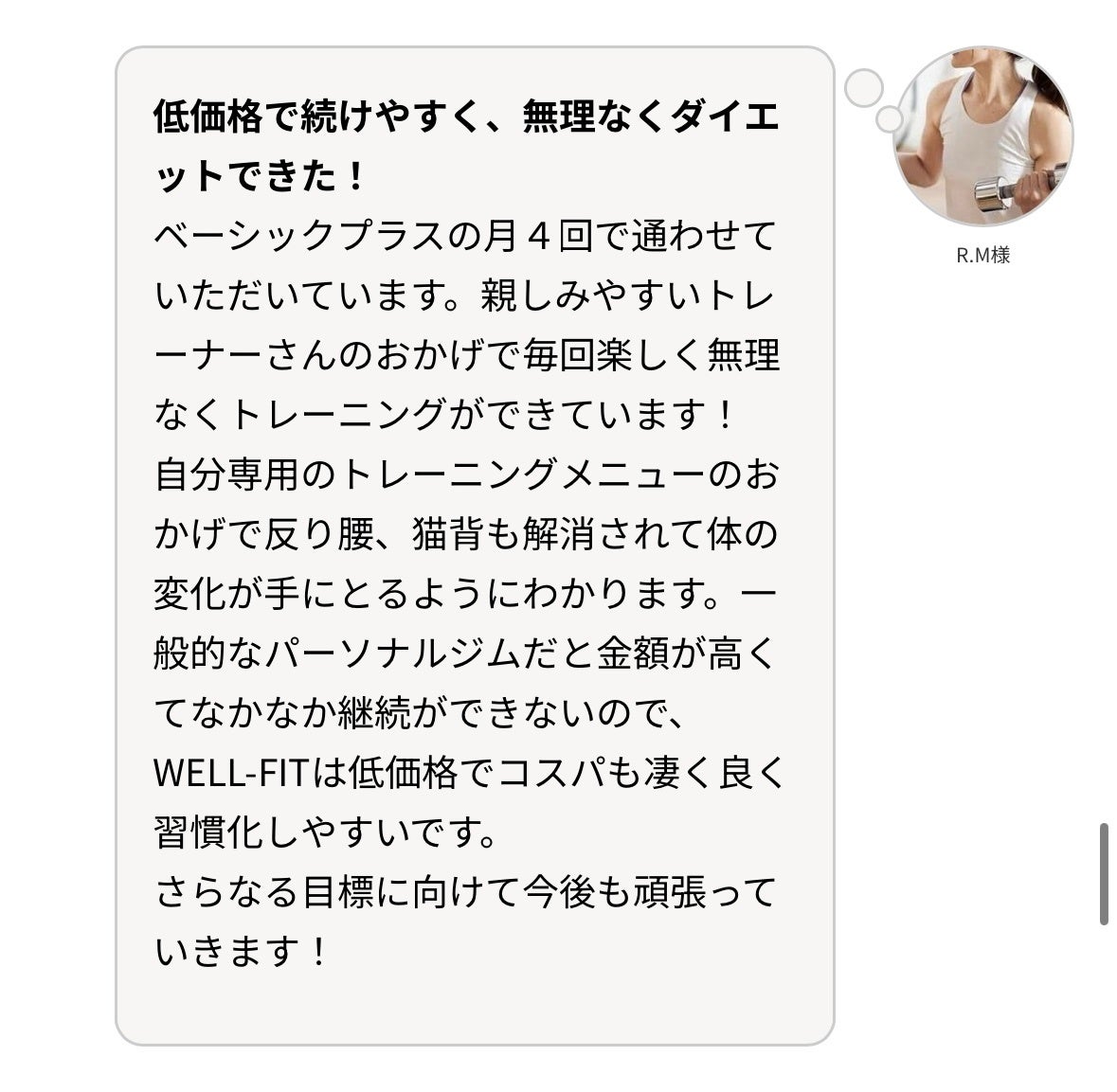 トレーナーさんはとても明るくていつも励ましてくれるので諦めずにここまで来れました。何よりも楽しく通えています。