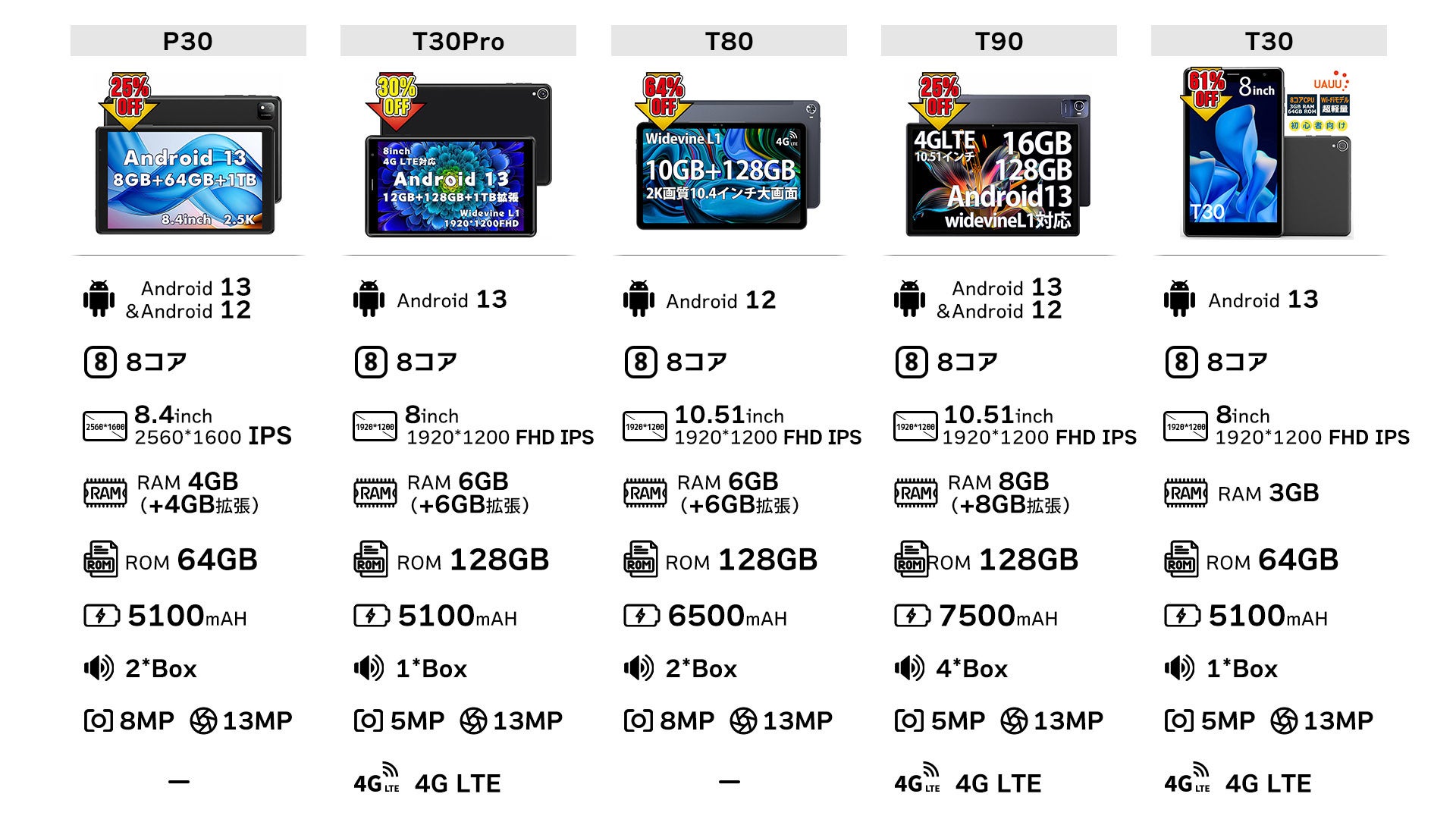 P30 / T30Pro / T80 / T90 / T30 スペック