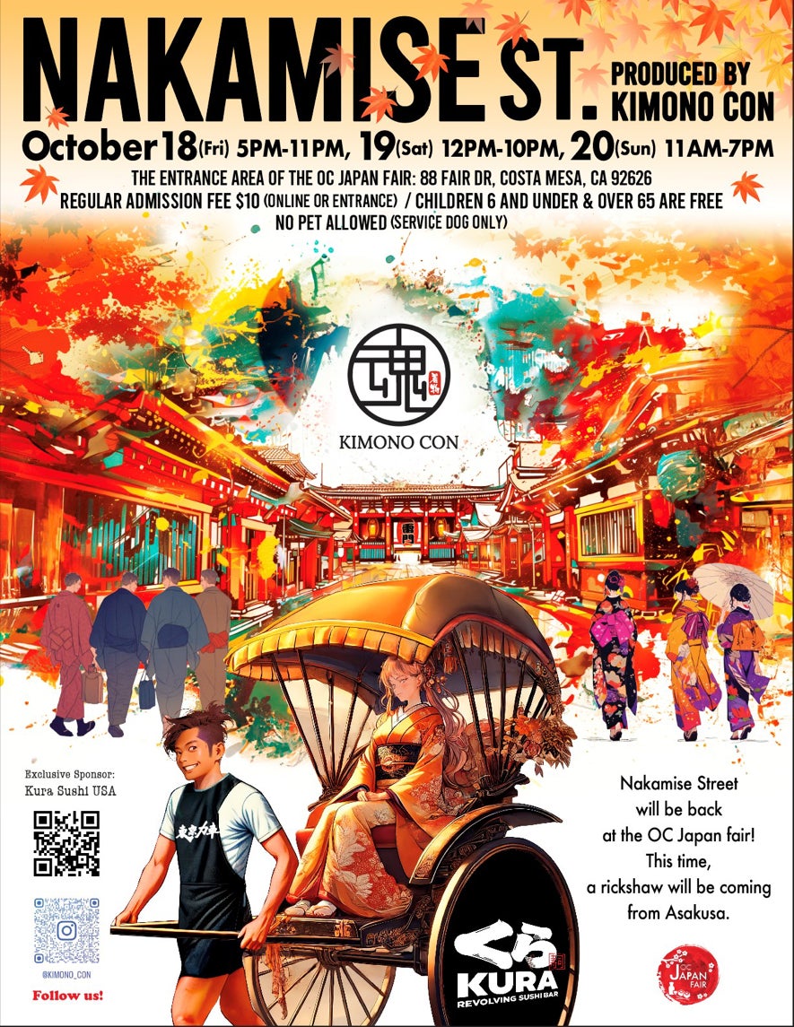 ロサンゼルスで設立された非営利団体「KIMONO CON」は、2024年10月18日(金)から10月20日(日)まで、カリフォルニア州コスタメサ市フェアドライブ88番地、OCフェア&イベントセンターで開催されるオレンジカウンティジャパンフェアで「Nakamise Street(仲見世通り)」をプロデュースします。