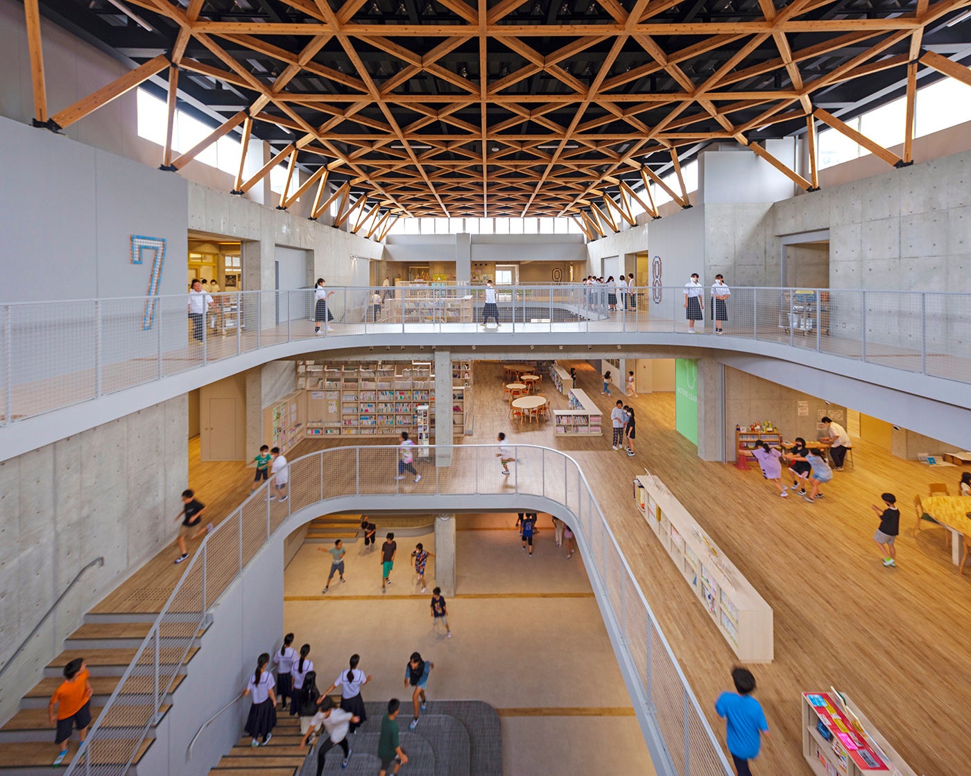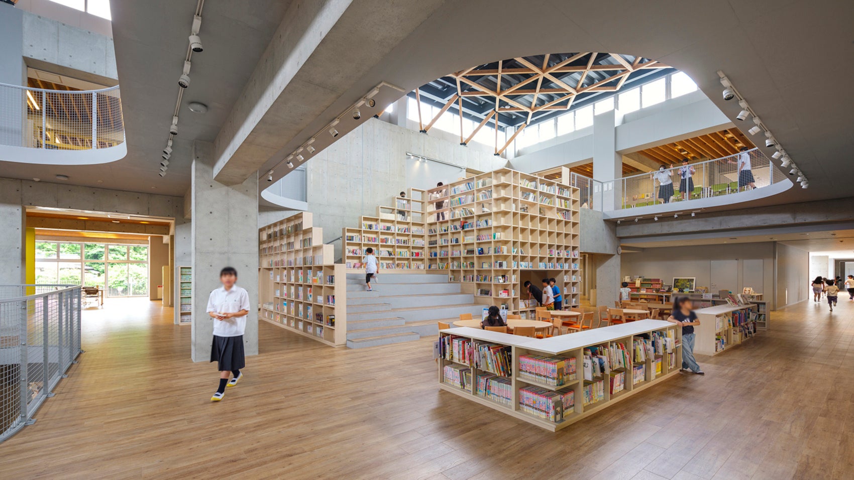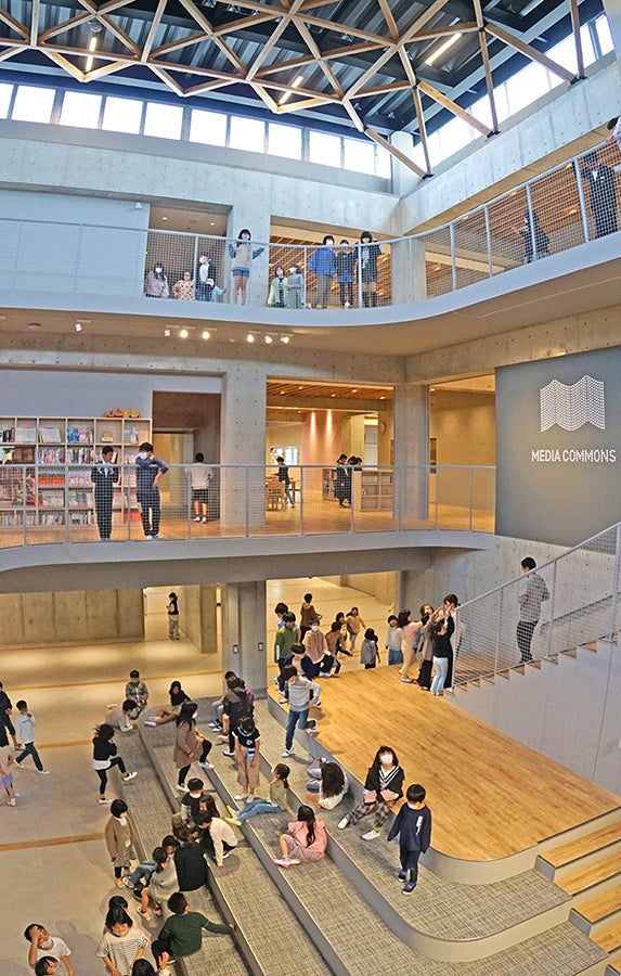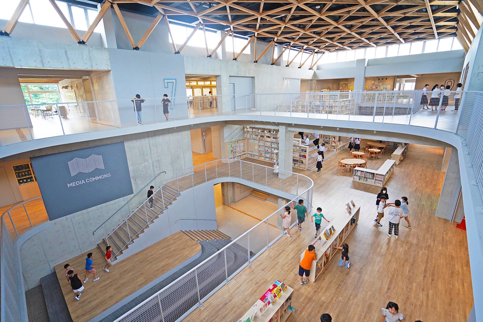 義務教育学校とは、小学校から中学校までの義務教育を一人の校長と一つの教職員組織で一貫して行う、小中一貫校よりも柔軟な運用が可能な新たな学校のカタチで、2016年から制度化されたものです。今回のプロジェクトは、嘉麻市が新たに整備した3つの義務教育学校の1校となります。計画にあたっては、非常に短い工期で設計と工事を行うために、設計者と施工者がタッグを組み、設計から工事までを一貫して行う「デザインビルド」という方式で発注されました。市の目指す学校像はもちろんのこと、設計期間中に文部科学省より公表された「新しい時代の学びを実現する学校施設の在り方について」という報告書を受け、発注者・設計者・施工者そして学校が一体となって、子どもたちが一日の大半を過ごすことになる新たな環境の在り方について深く議論し、稲築東義務教育学校を実現しました。最も大きな特徴は、学校の中心に「メディアコモンズ」という吹抜け空間をもつ図書スペースであり、通路であり、発表の場であり、学習の場としても機能する共用部をつくったことです。