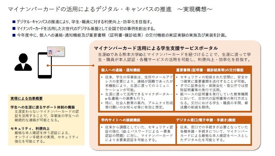 熊本大学では、「総合情報環構想2022」及び第4期中期目標・中期計 画に基づき、デジタル活用による、教育改善・業務効率化等への展開や大学 全体のDXを進めています。その中で、業務全般の継続性の確保と併せて、 機能を高度化するとともに、事務システムの効率化や情報セキュリティ確保 を目指しています。 一方、日本国内においては、マイナンバーカードの保有数は、国民の7割 以上に相当する8,800万件を超え、デジタル社会のパスポートとしての 環境が整いつつあります。 熊本大学では、デジタル・キャンパスの更なる進展に向け、マイナンバー カードを活用した業務効率化や学生・教職員に対する利便性向上の検討を進 めることを決定し、株式会社野村総合研究所(NRI)と「マイナンバーカー ドの活用によるデジタル・キャンパスの推進」に向けた実証実験を実施しました。