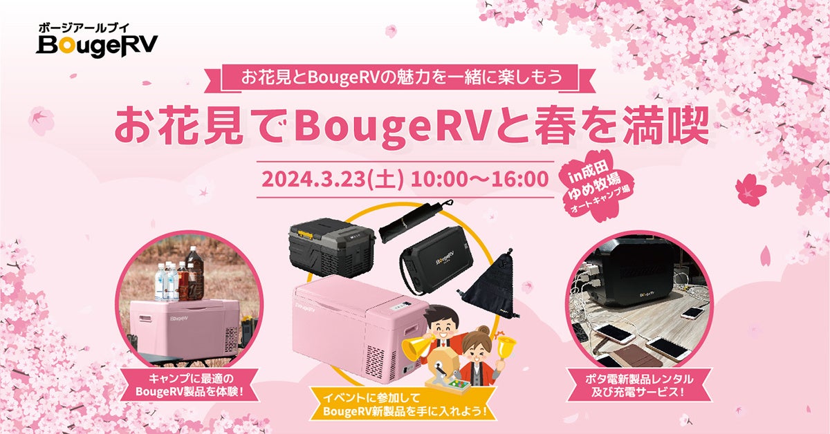 昨今のキャンプブームからキャンプ人口は年々増加し、お花見においても単に桜を見る、宴会をするだけでなく、お花見をしながらキャンプをするといった人が増えています。BougeRVが提供するポータブル冷蔵庫、ポータブル電源、ポータブルエアコンといった製品は、お花見キャンプなどのイベントにも便利で、より楽しい時間を過ごすお手伝いをできると考えています。こういった背景から、この度、お花見キャンプでBougeRVの製品を体験いただけるイベントを開催することとなりました。