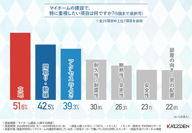 はじめに、「マイホームの建設で、特に重視したい項目は何ですか?(5個まで選択可)」と質問したところ、『立地(51.6%)』と回答した方が最も多く、次いで『間取り・動線(42.5%)』『アクセスのよさ(39.3%)』となりました。