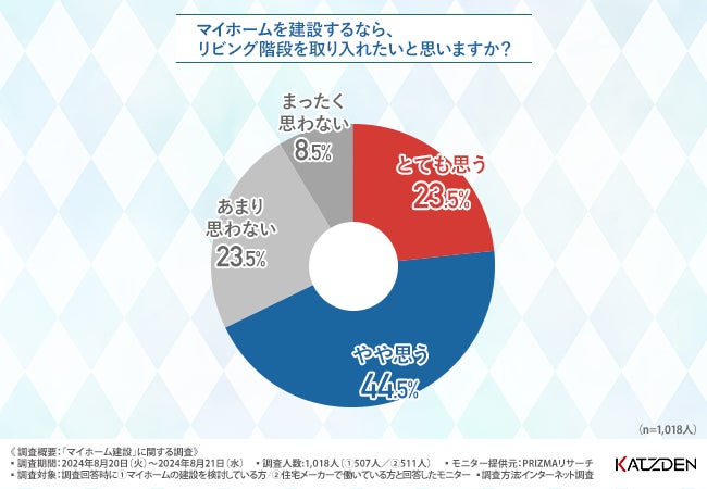 「マイホームを建設するなら、リビング階段を取り入れたいと思いますか?」と質問したところ、7割近い方が『とても思う(23.5%)』『やや思う(44.5%)』と回答しました。