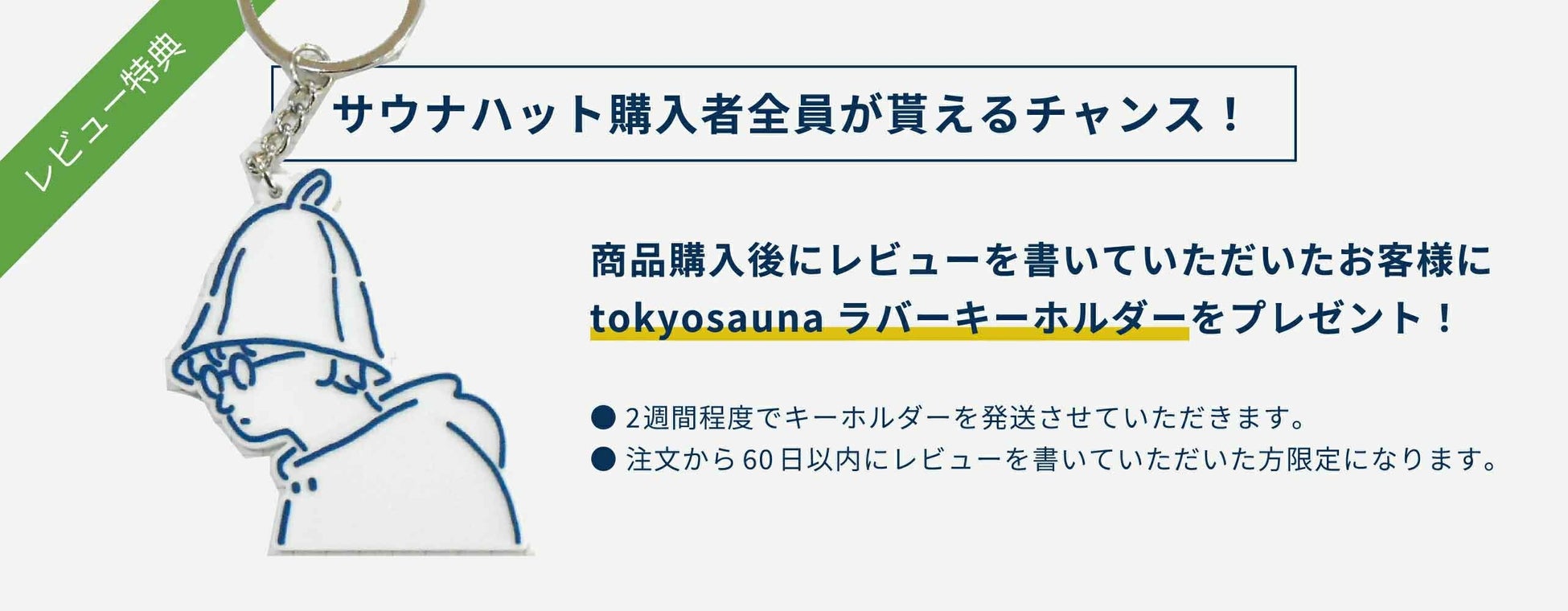 楽天市場にて「tokyosaunaサウナハット」をご購入いただき、ご注文から60日以内にレビューを投稿していただいた方に先着でラバーキーホルダーを配布します。