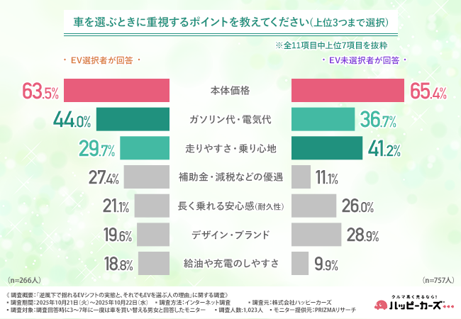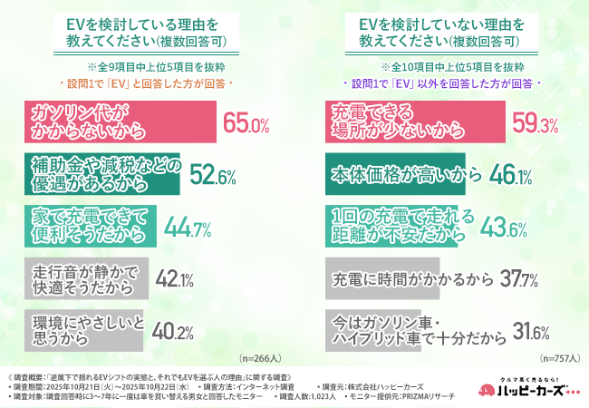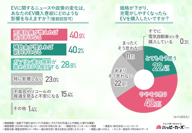 株式会社ハッピーカーズ(本社所在地:神奈川県鎌倉市、代表取締役:新佛 千治)は、3〜7年に一度は車を買い替える男女を対象に、「逆風下で揺れるEVシフトの実態と、それでもEVを選ぶ人の理由」に関する調査を実施しました。