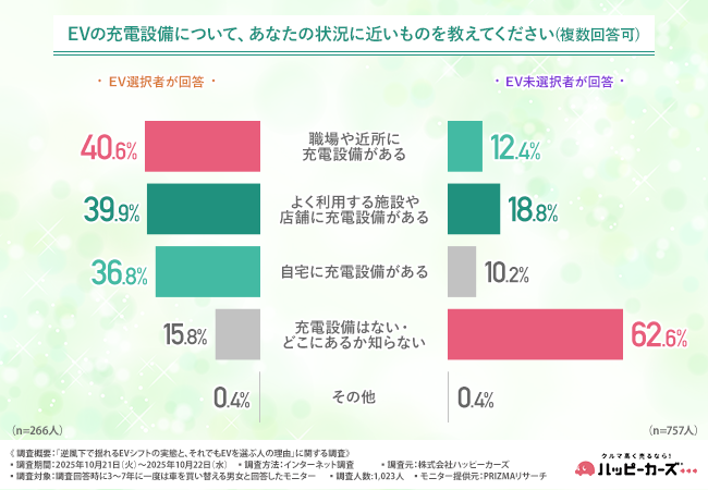 EV選択者は、職場・近所・よく利用する施設や店舗に充電設備があることを認識している方が多く、自宅に充電設備がある方も約4割いました。
