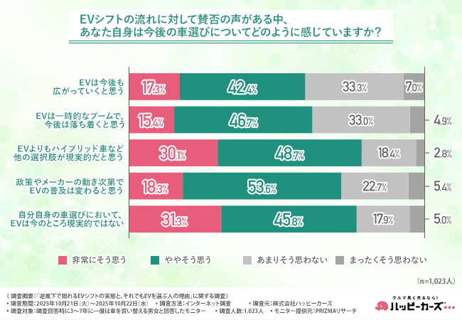 そこで今回、車買取り専門店の株式会社ハッピーカーズ(https://happycars.jp/)は、3〜7年に一度は車を買い替える男女を対象に、「逆風下で揺れるEVシフトの実態と、それでもEVを選ぶ人の理由」に関する調査を実施しました。