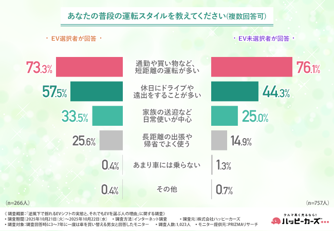 EV未選択者よりも長距離の運転スタイルが比較的多く、そのためEVの走行時の騒音や振動が少ないという快適性、燃料効率のよさなどのメリットを意識することが多いと考えられます。