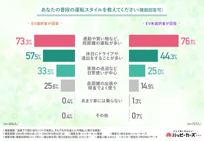 「あなたの普段の運転スタイル」を尋ねたところ、次に買い替える車についてEV選択者・EV未選択者で、それぞれ以下のような回答結果になりました。