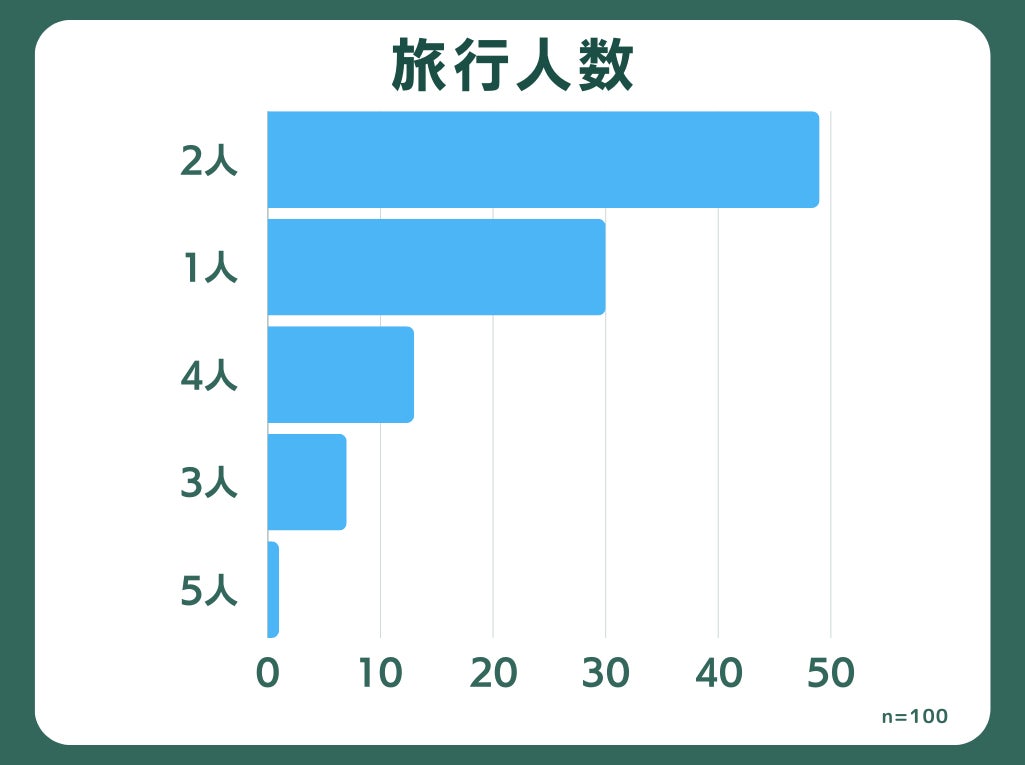 「何人で旅行したか」という質問には、「2人」と回答した人が最も多く約半数を占めました。