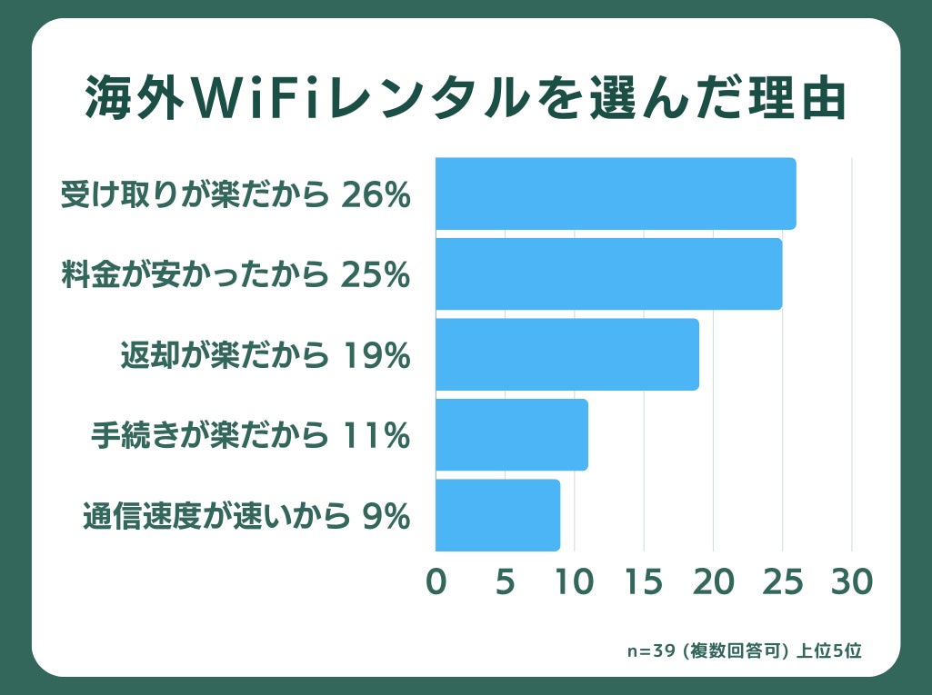 海外旅行の通信手段に「海外WiFiレンタル」を選んだ人に絞ると「受け取りが楽だから」が26%で最も多い理由となりました。