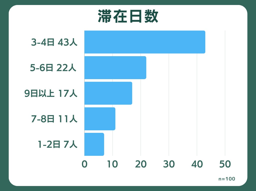 「滞在日数」について聞くと、「3-4日」と回答する人が最も多い結果となりました。1週間以内の滞在が全体の72%を占めており、比較的短期の海外旅行が主流であることがわかります。一方で、9日以上の長期滞在も17%あり、コロナ禍が明けて長期の旅行を楽しむ人もいることが伺えます。