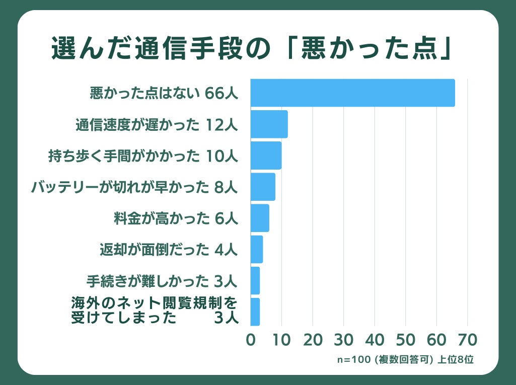 66人が「悪かった点はない」と回答しており、全体的な満足度が高いことが伺えます。一方で、通信速度の期待に答えられなかったケースや、WiFi機器を持ち歩く手間を感じた人もいるようです。