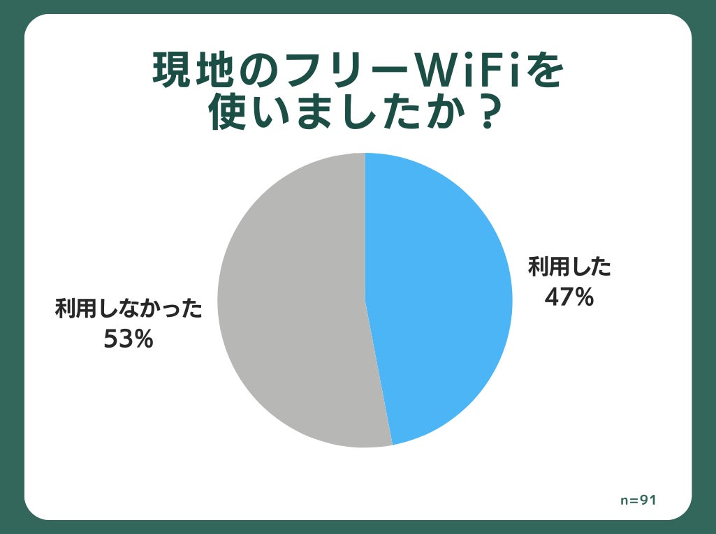 何らかの通信手段を用意した人に、現地のホテルや観光スポットにあるフリーWiFiを利用したかについて質問すると、「利用した」が47%、「利用しなかった」が53%でした。