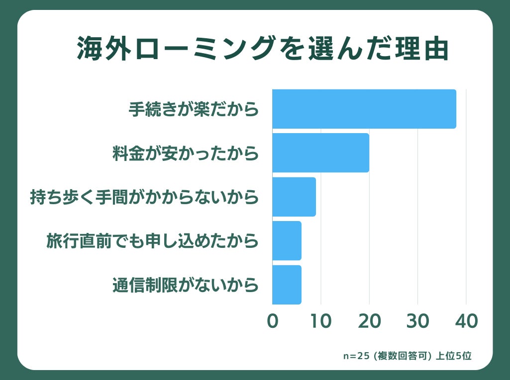 海外旅行の通信手段に「海外ローミング」を選んだ人に絞ると、「手続きが楽だから」が38%で最も多い理由となりました。各キャリアのサイトやアプリから手軽に申し込めたり、旅行先にWiFi機器を持ち歩く必要がないといった、海外ローミングの利点が選ばれる理由になっていると考えられます。