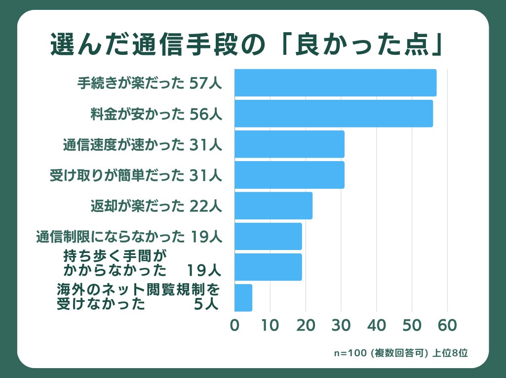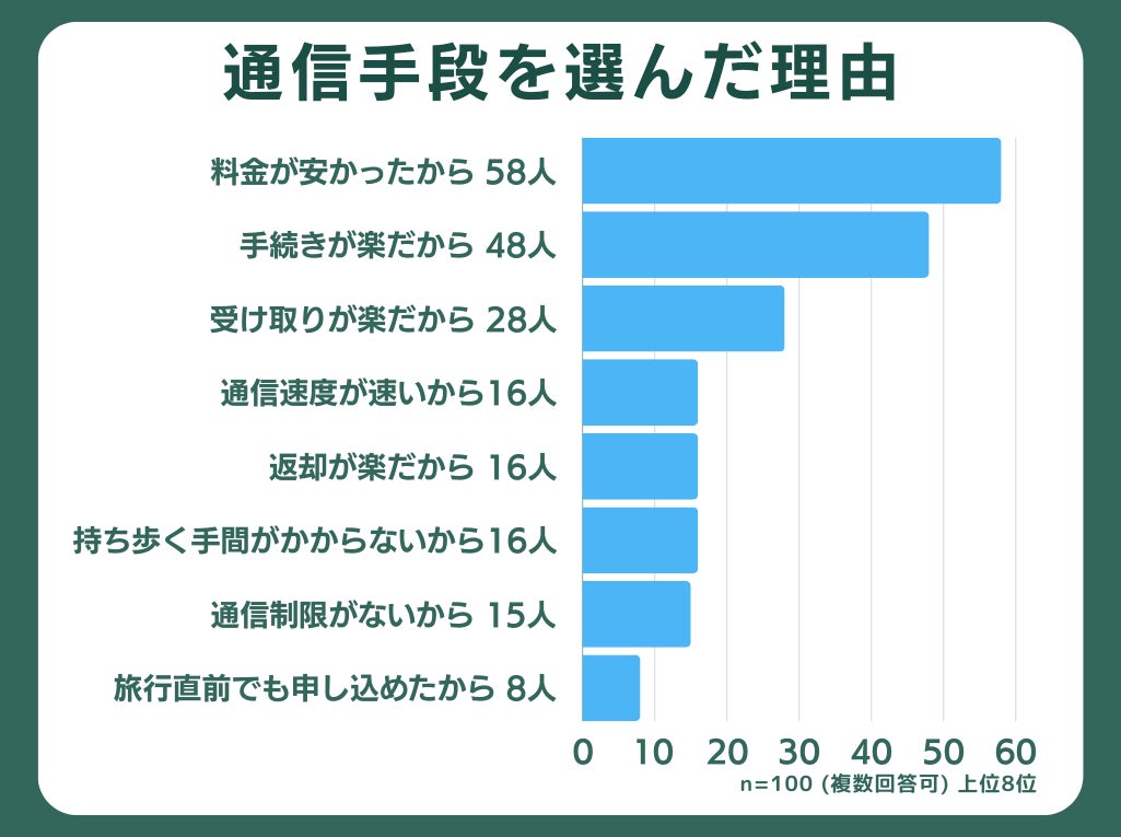 通信手段を選んだ理由を最大3つまで聞いたところ、「料金が安かったから」「手続きが楽だから」「受け取りが楽だから」が多い結果となりました。このことから、料金の安さはもちろんのこと、旅行の準備や旅行中の煩わしさの軽減といった利便性もニーズとして高いことが伺えます。また、通信速度や通信制限のニーズはあるものの、料金や手続きの簡便さほど優先度が高くないことがわかります。