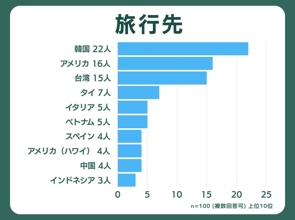 コロナ禍明けに海外旅行に行った100人に「旅行先」を聞いたところ、「韓国」が最も多く、次いで「アメリカ」と「台湾」が多い結果となりました。アジア圏が多くランクインしており、その人気が伺えます。