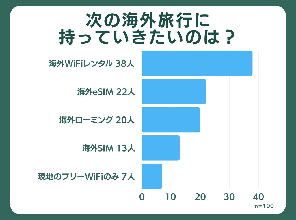 加えて、「海外eSIM」にしたいと回答する人が22人と多く、eSIM対応デバイスの増加とその利便性が評価されていることが伺えます。今後、eSIM対応端末がさらに普及すれば、利用者が増加する可能性があるといえるでしょう。