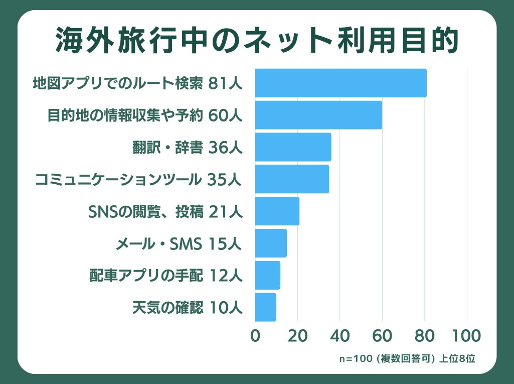 海外の見知らぬ土地に対する不安を払拭し、効率よく移動したいというニーズがあることが伺えます。また、スムーズにインターネットを利用できることが、快適な海外旅行のキーになると言っても過言ではないかもしれません。