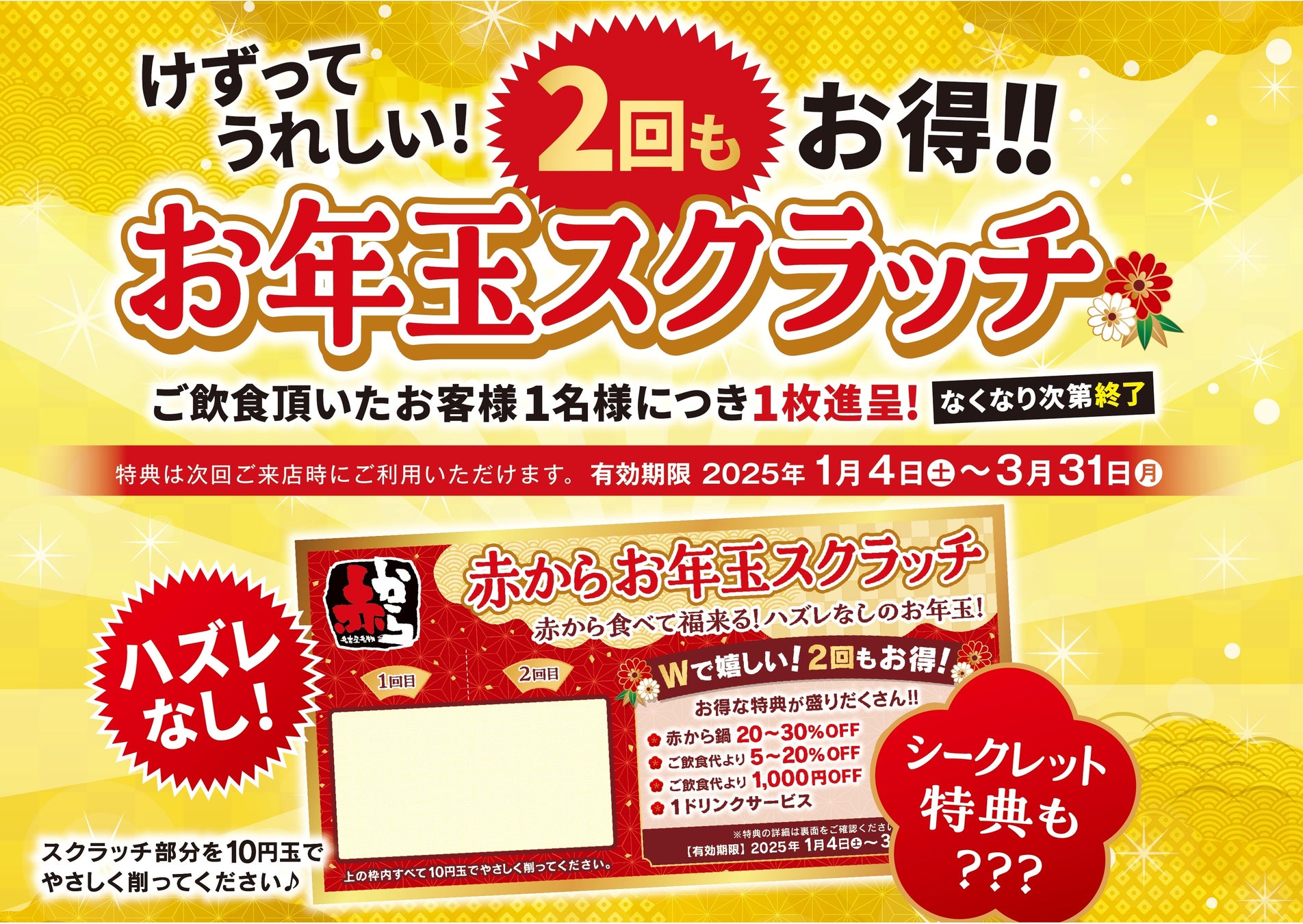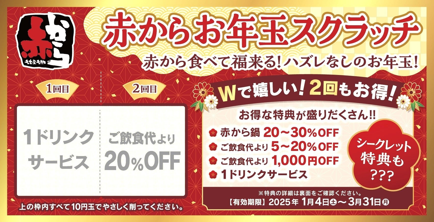 けずってうれしい!2回もお得に楽しめる!!大好評「赤からお年玉スクラッチ」企画を今年も開催