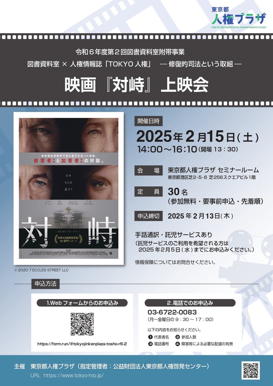 【申込先着順】図書資料室×人権情報誌『TOKYO人権』 -修復的司法という取組- 映画『対峙』上映会