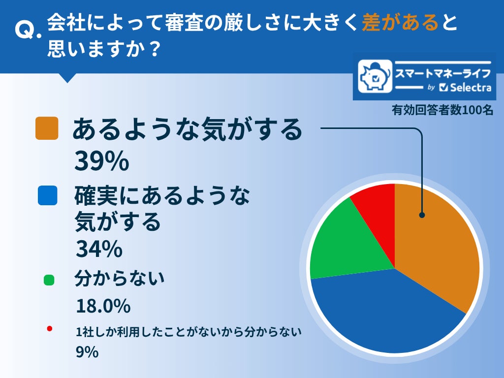 結果は以下の通りです。7割以上が審査の厳しさに違いを感じていることが分かりました。