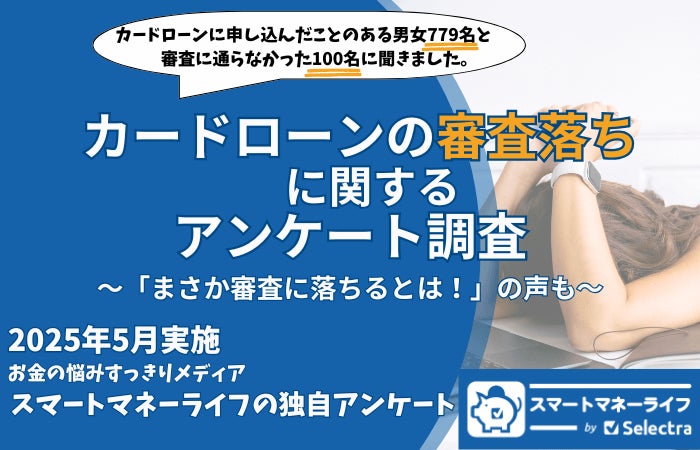 セレクトラ・ジャパン株式会社(東京都渋谷区、代表取締役:グザビエ・ピノン)の運営するオンラインメディア、スマートマネーライフでは、実際にカードローンを申し込んだことのある男女779名と、そのうち審査に落ちた経験のある100名を対象に独自アンケートを実施しました。