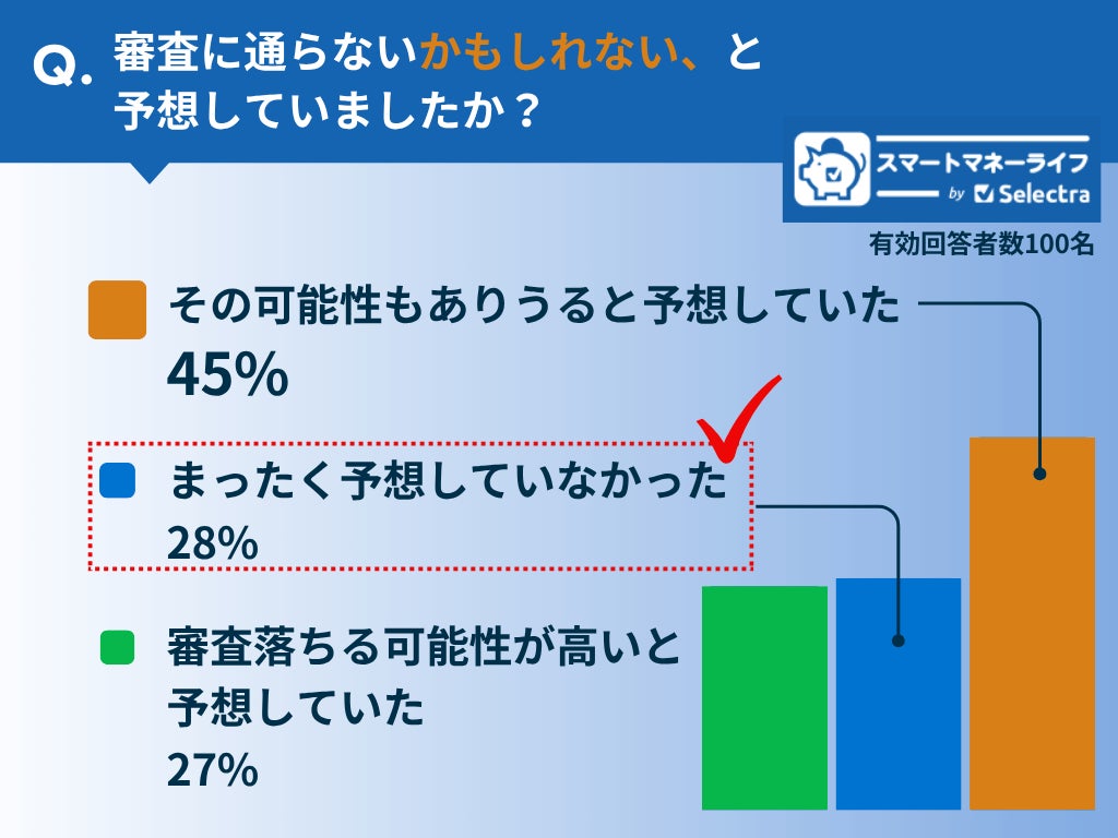 その結果、「まったく予想していなかった」が28名、「その可能性もありうると予想していた」が45名、「審査落ちる可能性が高いと予想していた」が27名という結果となりました。