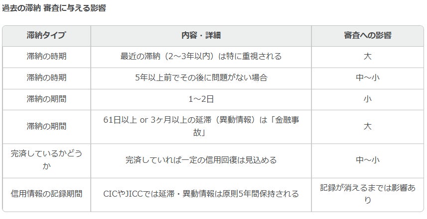あくまで参考に、過去の滞納のタイプによって、どの程度、審査に影響を与えるかを一覧にしました。直近ですでに滞納がある場合は、ほとんどの金融機関で直ちに審査落ちになると考えらえます。