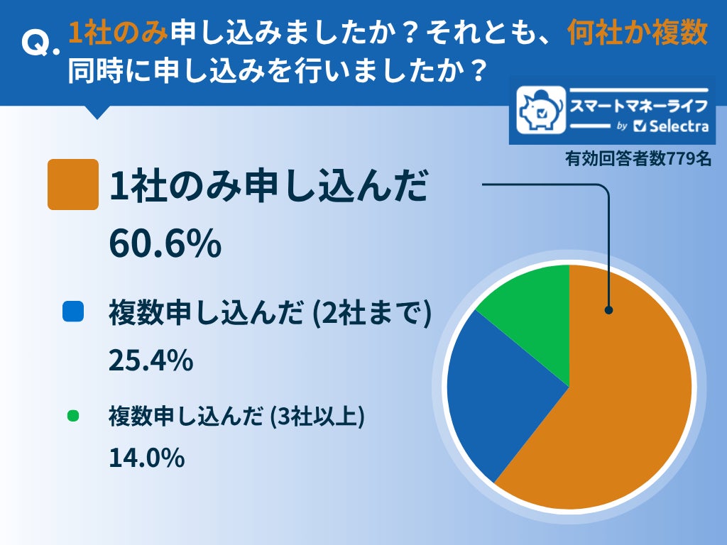 最も多いのが、「1社のみ申し込んだ」で60.6%、「複数申し込んだ(2社まで)」(2社まで)で25.4%、「複数申し込んだ(3社以上)」は14.0%となりました。