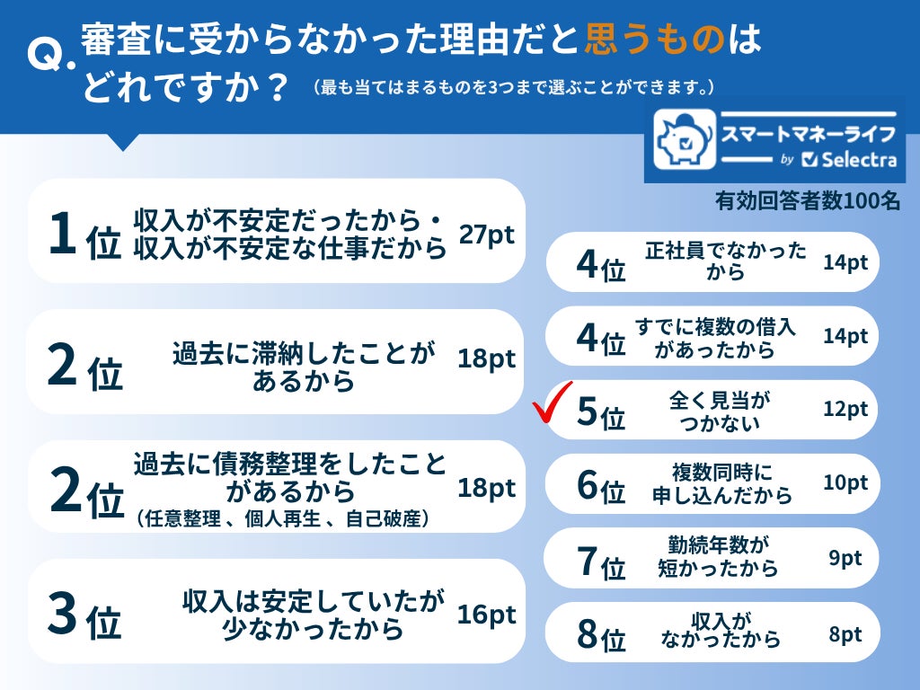 引き続き対象者100名に「審査に受からなかった理由だと思うものはどれですか?」という質問をしました。