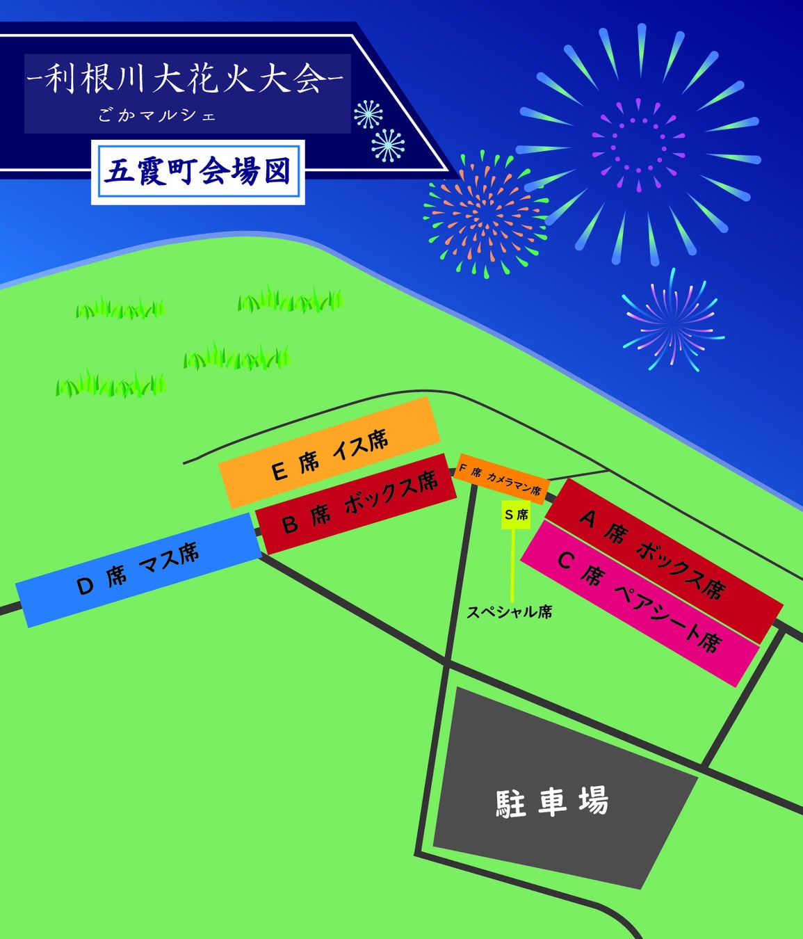 ごかマルシェ(利根川大花火大会 五霞町会場)観覧席チケットを、一般販売に先行して五霞町ふるさと納税の返礼品として寄附を受け付けています。五霞町会場でも特に花火が見やすい「ボックス席最前列プラン」と「キャンピングカー(貸出)宿泊プラン」をご用意しました。