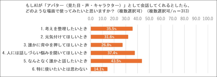 次に、対話型AIとの会話が気持ちや思考に「良い影響を与えている」(70.2%・単一回答)と感じる人が多い中で、「AIがアバター(見た目・声・キャラクター)として会話してくれるとしたら、どのような場面で使ってみたいと思うか」(複数回答、n=313)を尋ねました。その結果、「なんとなく誰かと話したいとき」(43.5%)が最多となり、続いて「人には話しづらい悩みを聞いてほしいとき」(37.4%)、「考えを整理したいとき」(35.5%)が挙がりました。