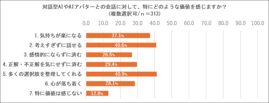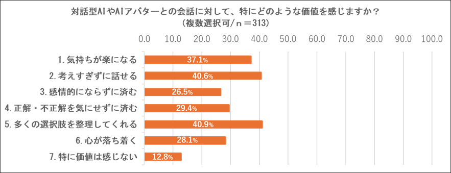 最後に、「対話型AI(ChatGPTなど)やAIアバターとの会話に対して、特にどのような価値を感じますか?」(複数選択、n=313)と尋ねると、「多くの選択肢を整理してくれる」(40.9%)、「考えすぎずに話せる」(40.6%)と並び、これに「気持ちが楽になる」(37.1%)、「正解・不正解を気にせずに済む」(29.4%)が続きました。