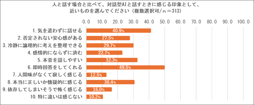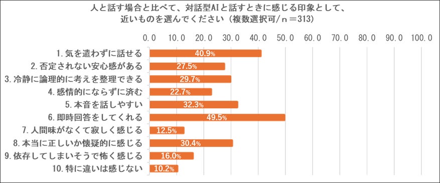 人と話す場合と比べて、対話型AIと話すときに感じる印象(複数回答、n=313)は「即時回答をしてくれる」(49.5%)が約半数を占めました。これに続き、「気を遣わずに話せる」(40.9%)、「本音を話しやすい」(32.3%)、「否定されない安心感がある」(27.5%)といった回答も目立ち、対話型AIが、感情や考えを素直に言葉にしやすい相手として受け止められている様子が明らかになりました。