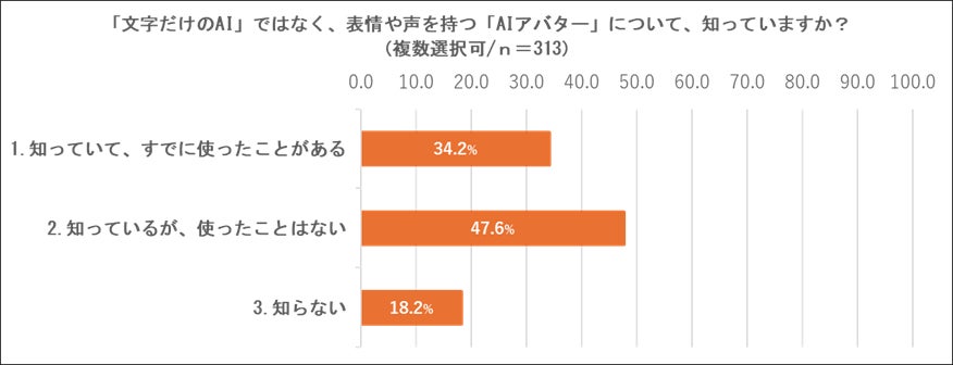 また、「Character AI などのキャラクター/アバター型AI」は16.8%にとどまりました。そこで、「表情や声を持つAIアバター」についての認知(単一回答、n=313)を尋ねたところ、「知っていて、すでに使ったことがある」が34.2%、「知っているが、使ったことはない」が47.6%となり、利用経験は限定的である一方、存在自体は81.8%と広く知られている状況が明らかになりました。