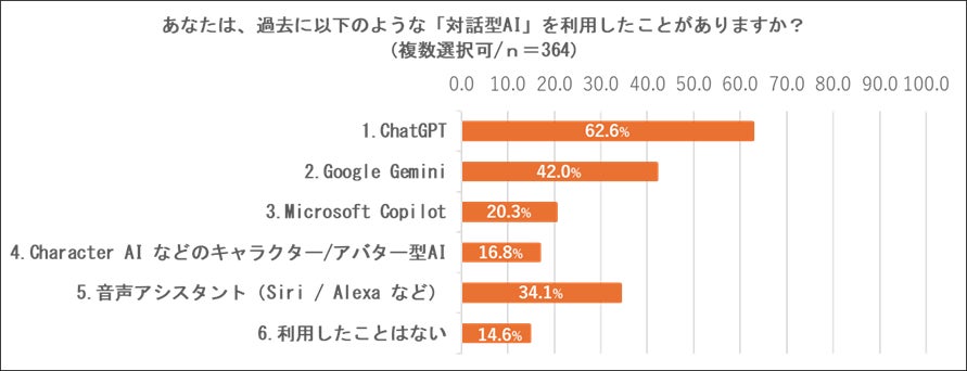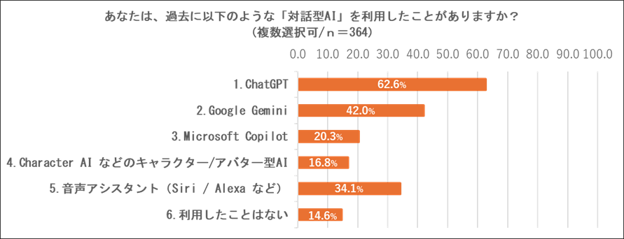 まず、「過去にどのような対話型AIを利用したことがあるか」(複数回答、n=364)を尋ねたところ、「ChatGPT」が62.6%で最多となり、「Google Gemini」が42.0%と続きました。