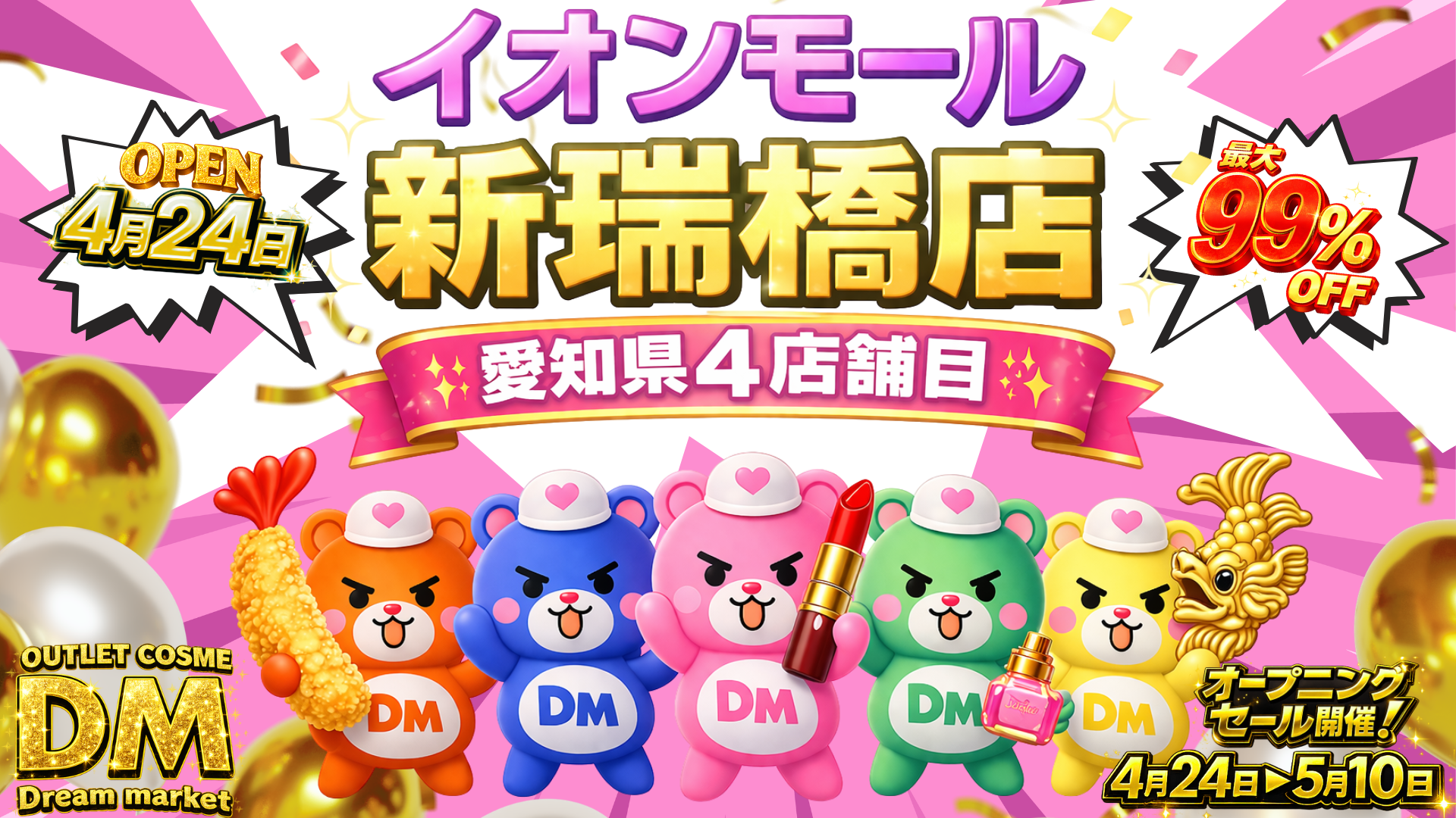 また、今回のイオンモール新瑞橋店のオープンを記念いたしまして、新瑞橋店以外のDream marketでもオープニングに合わせて4/24(金)~5/10(日)でセールを開催いたします。ぜひ、お近くのDream marketにもお立ち寄りください。想像を超える低価格商品を多数取り揃えるほか、さらにInstagramフォローでのプレゼントキャンペーンやLINE友だち限定クーポンも実施いたします。ぜひこの機会に、Dream marketならではのお得感を味わえるショッピングをお楽しみください。