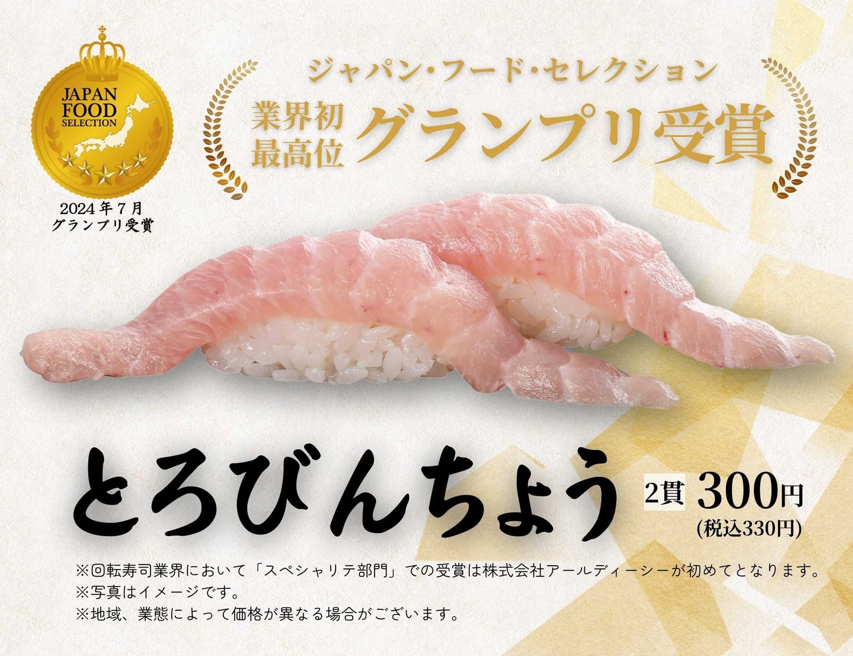 株式会社アールディーシー(代表取締役社長:大島敏彦 本社:埼玉県熊谷市)が運営する、グルメ回転寿司「がってん寿司」が定番メニューとして販売している「とろびんちょう」が、この度、一般社団法人日本フードアナリスト協会(東京都千代田区)が主催する「ジャパン・フード・セレクション」の「スペシャリテ部門(2024年7月)」において、最高位であるグランプリを受賞しました。スペシャリテ部門での受賞は、回転寿司業界で初めてとなります。