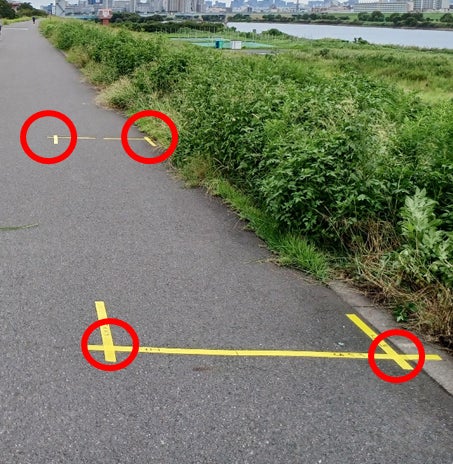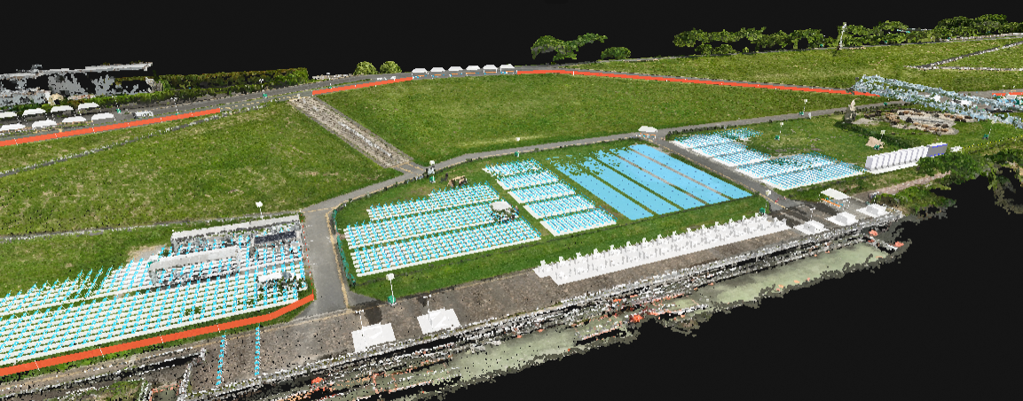また今回は、2024年度から有料観覧席の拡大によって大規模となる会場設営の効率化のため、什器や備品の配置の前処理として必要となる「墨出し」において、初めて3Dモデルを活用しました。従来の測定方法は、平面の図面から目測やスケールで測定したり、過去の経験や既存の物を基準に配置場所を特定したりしていましたが、3Dモデルの活用により、事前に什器、備品をレイアウトした3Dモデルに「墨出し」する場所を決定し、現地に目印をつけておくことで、広範囲の会場において、限られた作業者のリソースを有効に活用した作業計画が立てられ、設営作業を短時間で効率的に進めることが可能となります。