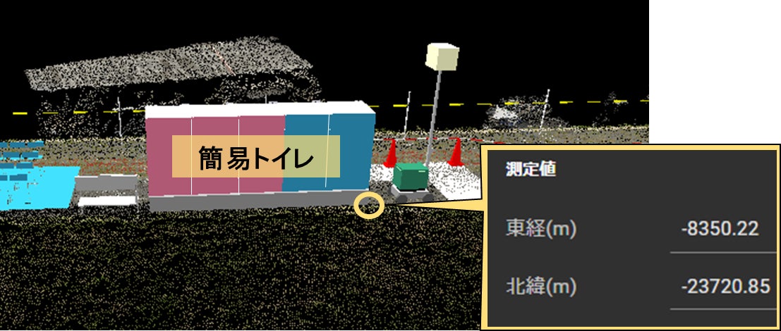 「墨出し」に使用する情報は、点群データの3次元座標値(X,Y,Z)です。デジタル空間に再現するイベント会場の3Dモデルは点群データによって形成されていますが、3Dモデル上に配置した什器の配置開始位置と終了位置を指定して、指定した場所の点の座標値(X,Y)を抽出します。この座標値を、測量アプリにインストールし、GNSS測量器※2と連携することで、現地の座標位置を検出し、「墨出し」を行うことができます。