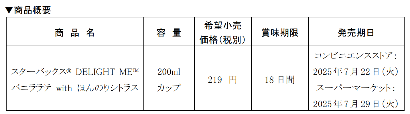 スターバックス・コーポレーション(本社:米国 シアトル、CEO:ブライアン・ニコル)と、サントリー食品インターナショナル株式会社(本社:東京都、社長:小野真紀子)は、スターバックスのチルドカップ新シリーズ「スターバックス® DELIGHT ME™ バニララテ with ほんのりシトラス」を、7月22日(火)から期間限定で発売します。