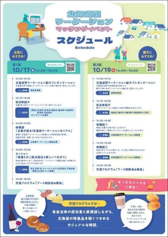 テーマは、それぞれ「企業向け」(17日)と「個人・親子向け」(19日)。当日に登壇する方々から、生の声を聞くことで、北海道型ワーケーションならではの働き方や暮らし方の魅力を知ることができます。