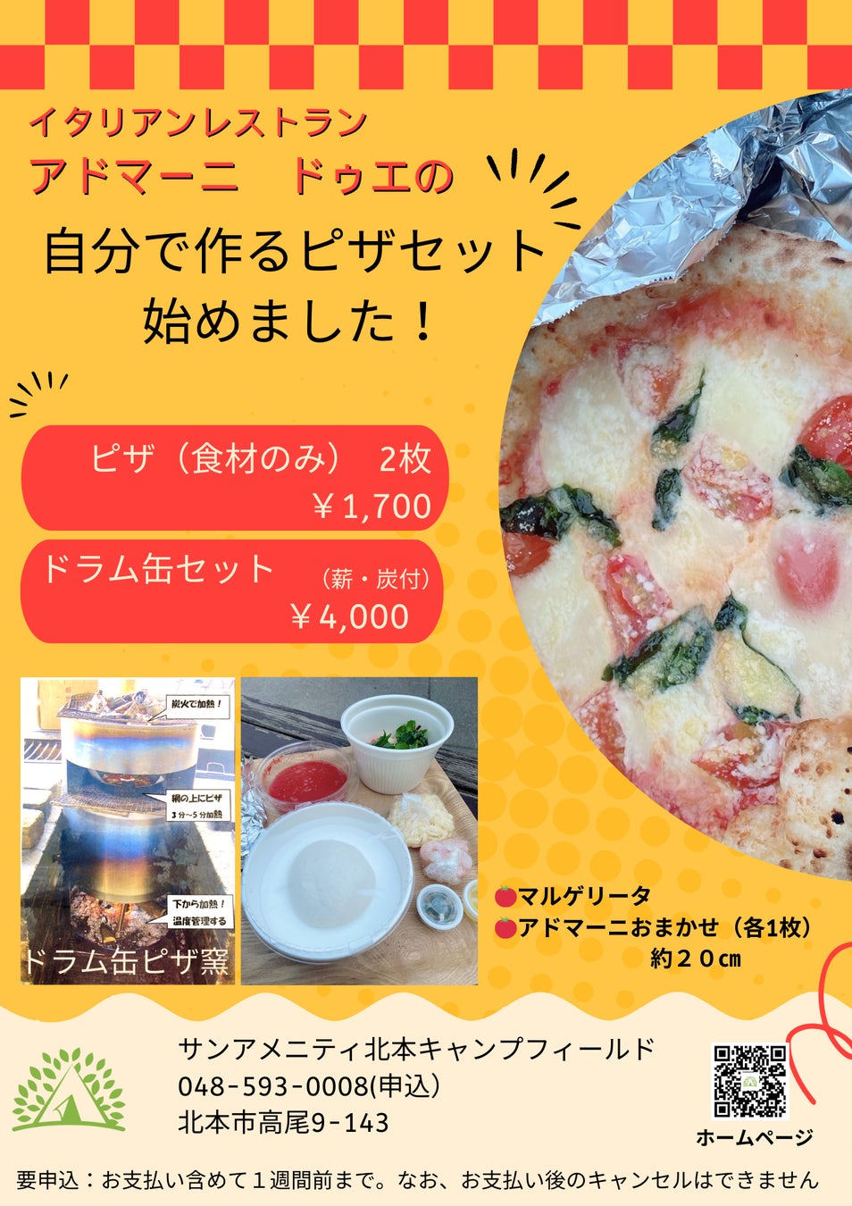 サンアメニティ北本キャンプフィールドでは、当施設の近くにある人気イタリアンレストラン「アドマーニ ドゥエ」のピザをご利用の皆様自身が作って楽しめる食材セットを始めました。