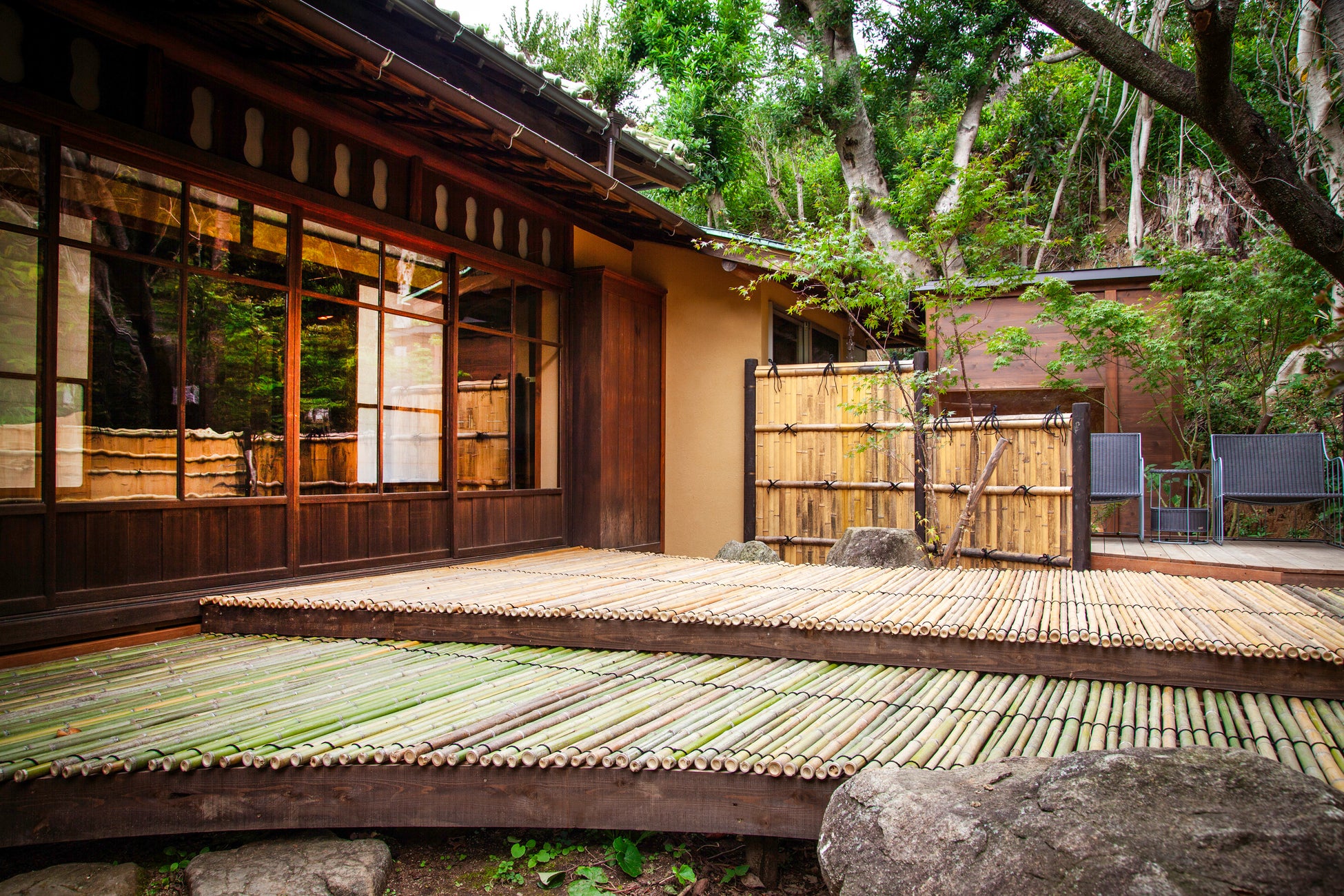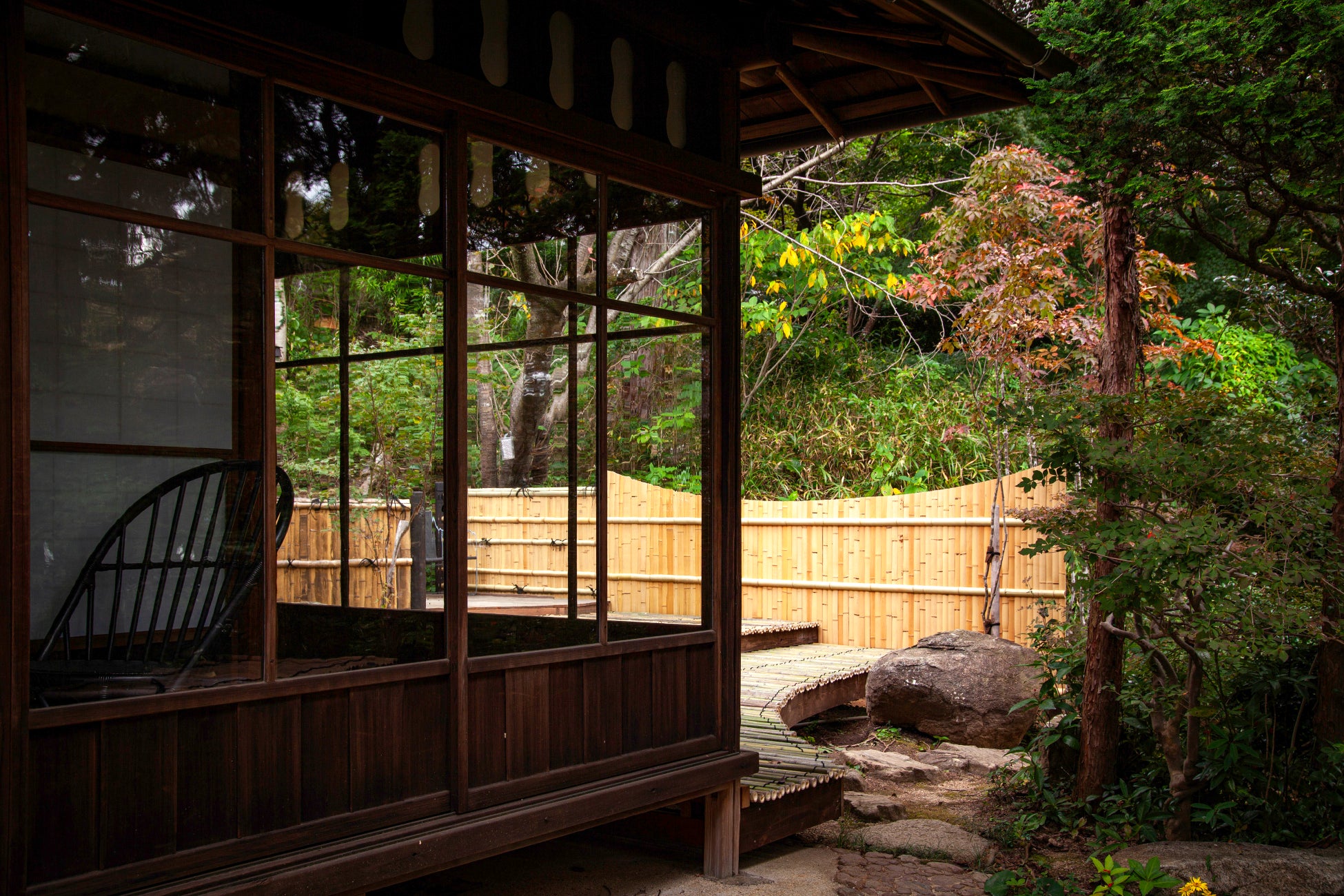 「鶯宿亭」は、1916(大正5)年に建築され、茶室と待合を備えた数寄屋風の佇まいを持つ木造平屋建て。木の温もりを感じさせる意匠・構造を残しつつ、内部改装を施し、現代的なインフラを整備しました。改装にあたっては、建築当初の面影を尊重しつつ、ガラス窓の導入や設備更新を通じて快適な滞在環境を実現。茶室空間、待合、寝室、温泉・サウナ、パウダールームなどを備え、ゆったりとした空間構成としました。また、建物外観には鶯色の瓦屋根や数寄屋造の美しい意匠を残し、歴史的景観を保全しています。