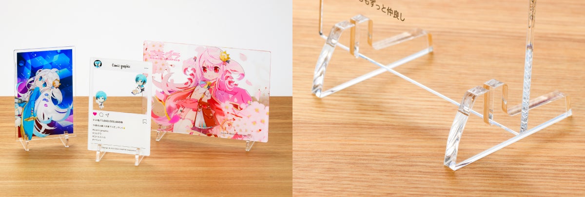 光沢のある透明なアクリル板に、お好きな写真やイラストを印刷できる商品です。アクリルならではの透明感がデザインを引き立て、フォトフレームや近年人気の”推し活”グッズとして活用いただけます。専用のアクリル製スタンド脚が付属しているので、そのまま組み立てて飾ることができます。