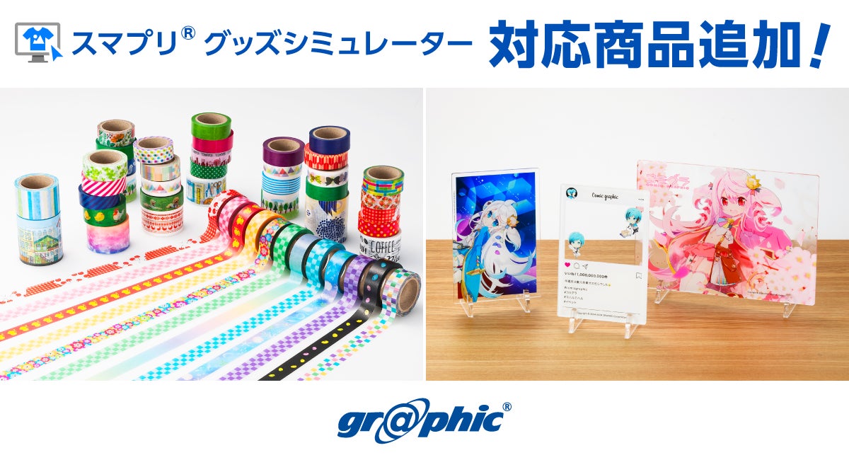 株式会社グラフィック(本社:京都市伏見区、代表取締役社長:西野能央、以下「当社」)はネット印刷事業にて、Webサイト上でオリジナルグッズが作れるサービス「スマプリ®グッズシミュレーター(以下:グッズシミュレーター)」に、マスキングテープとアクリルボードを追加しました。
