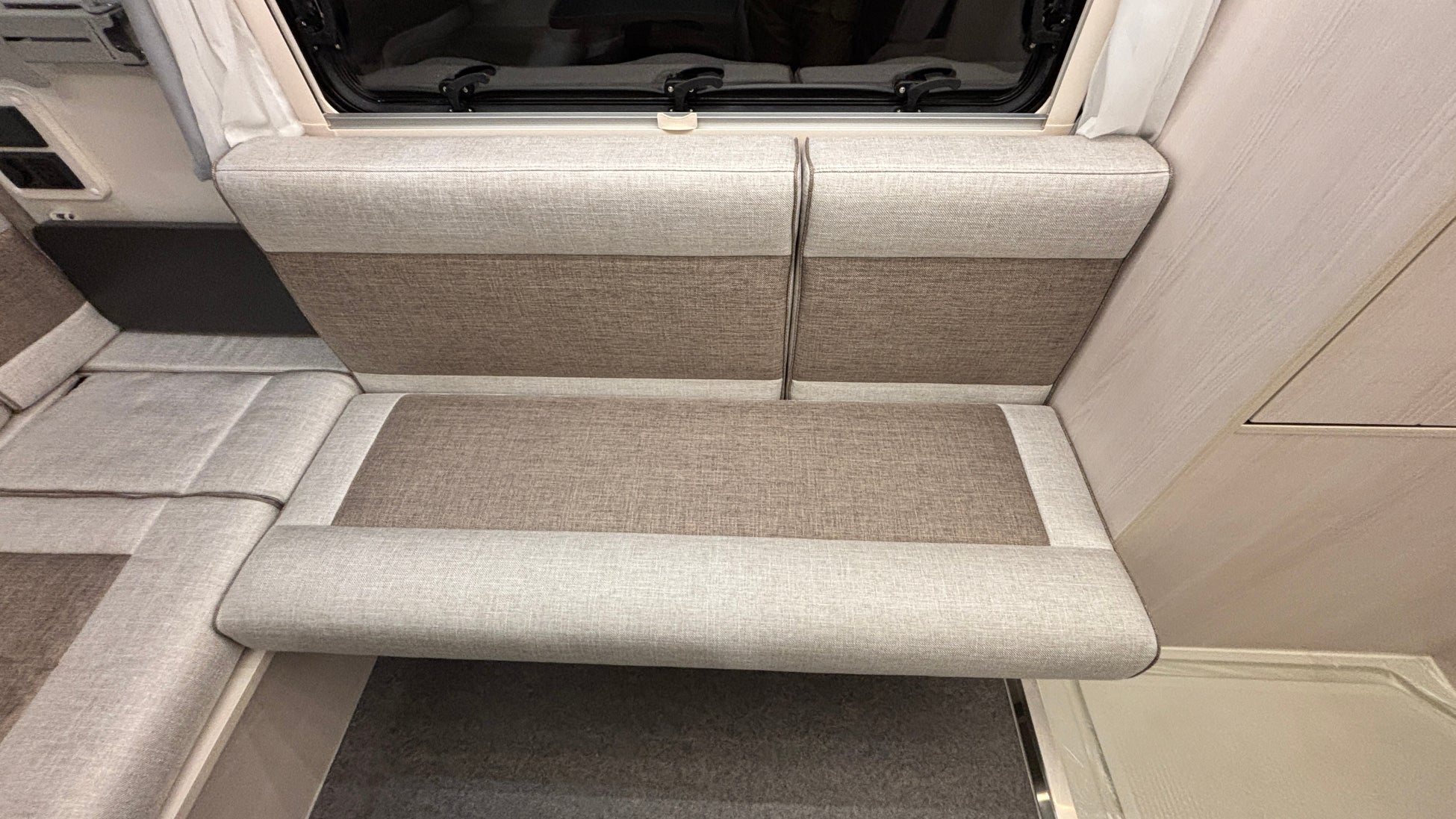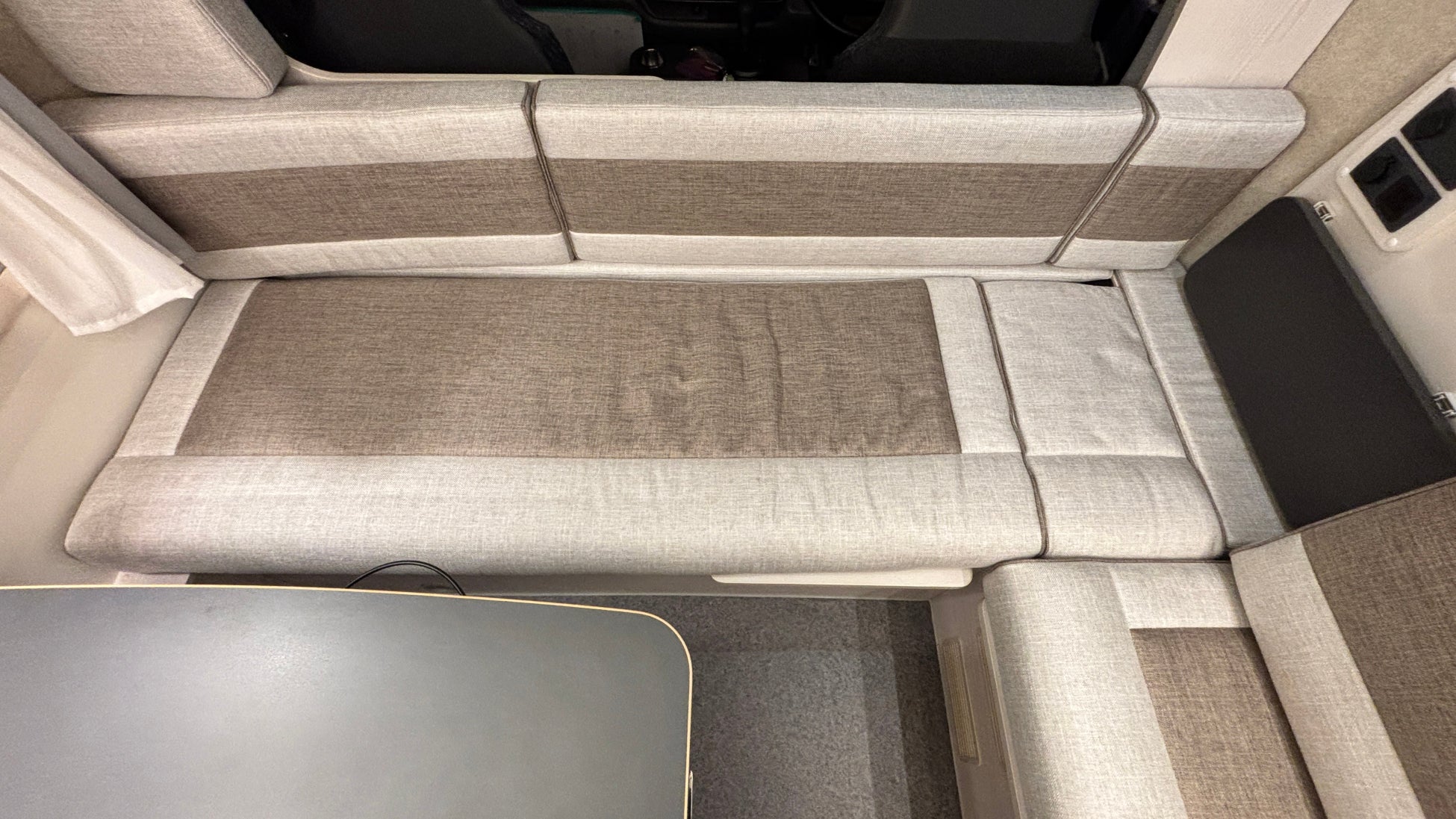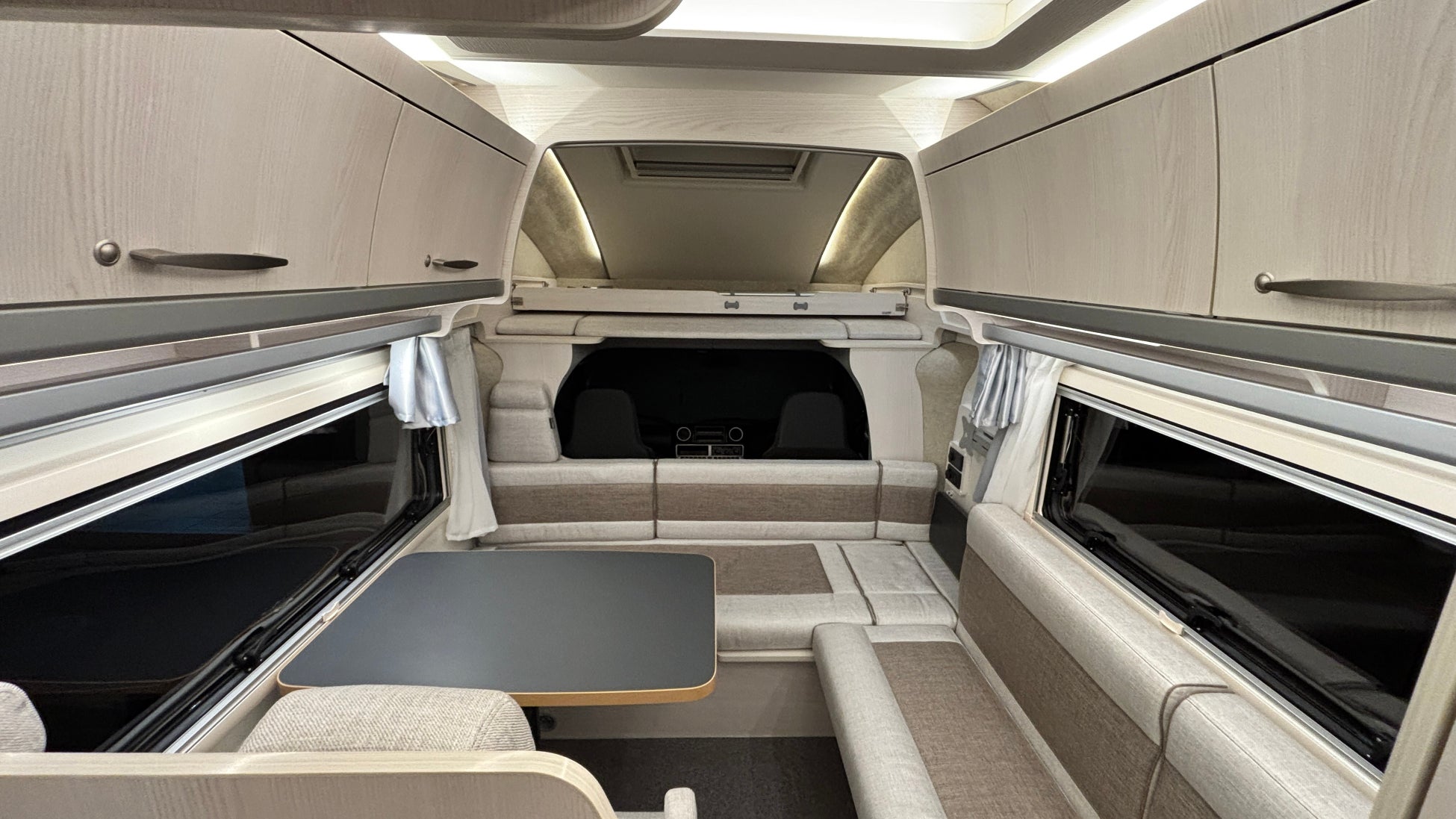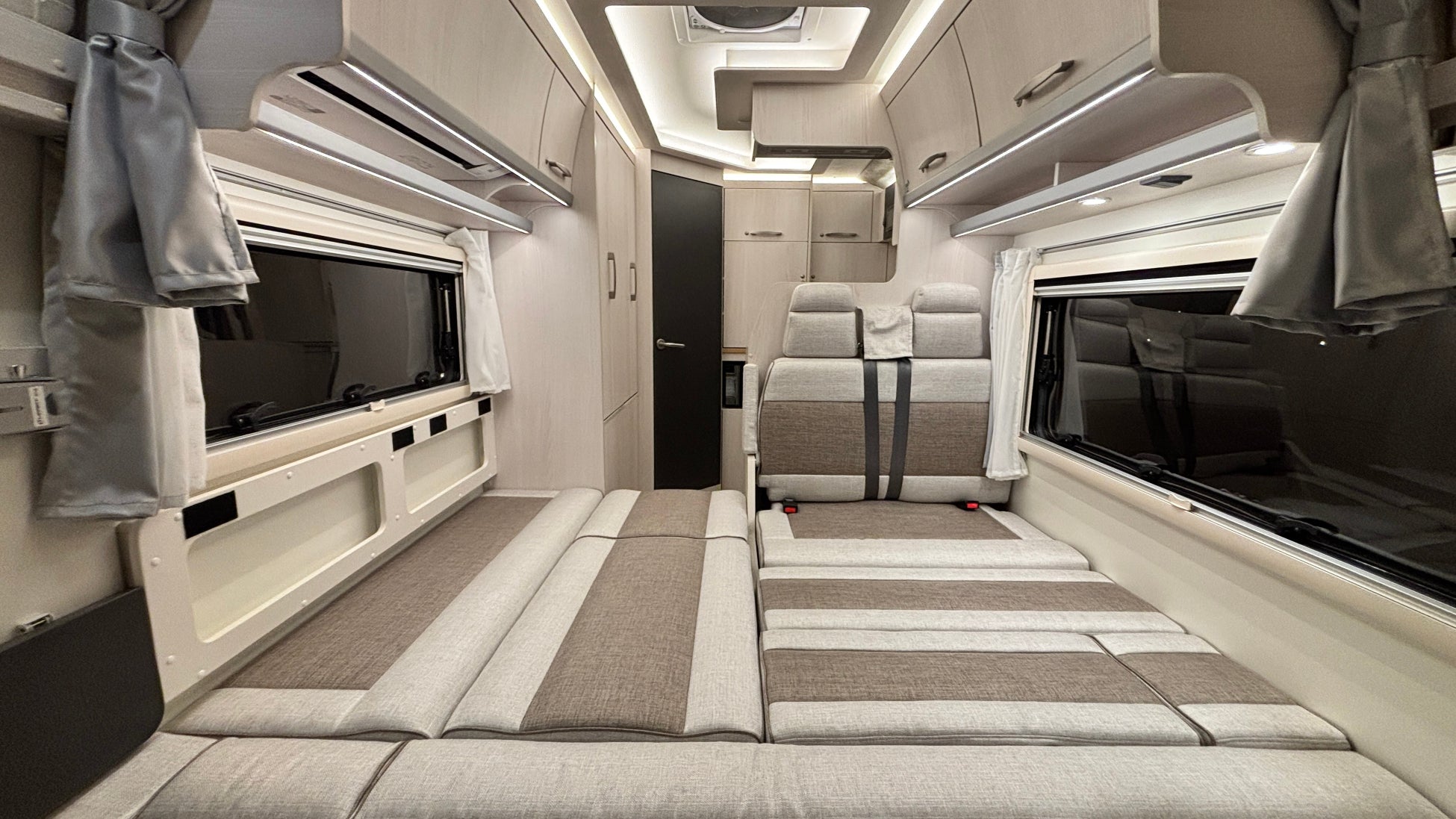 セカンドシートとサイドシートの背もたれを通路に埋め込むことで長さ1800mm×幅1860mmの広大なベッドスペースが生まれ、大人3名がゆったり就寝できるレイアウトとなります。バンクベッドにも近い一体感があり、家族で一日の旅を振り返りながら、笑い声が聞こえてくるような温かな空間になっています。
