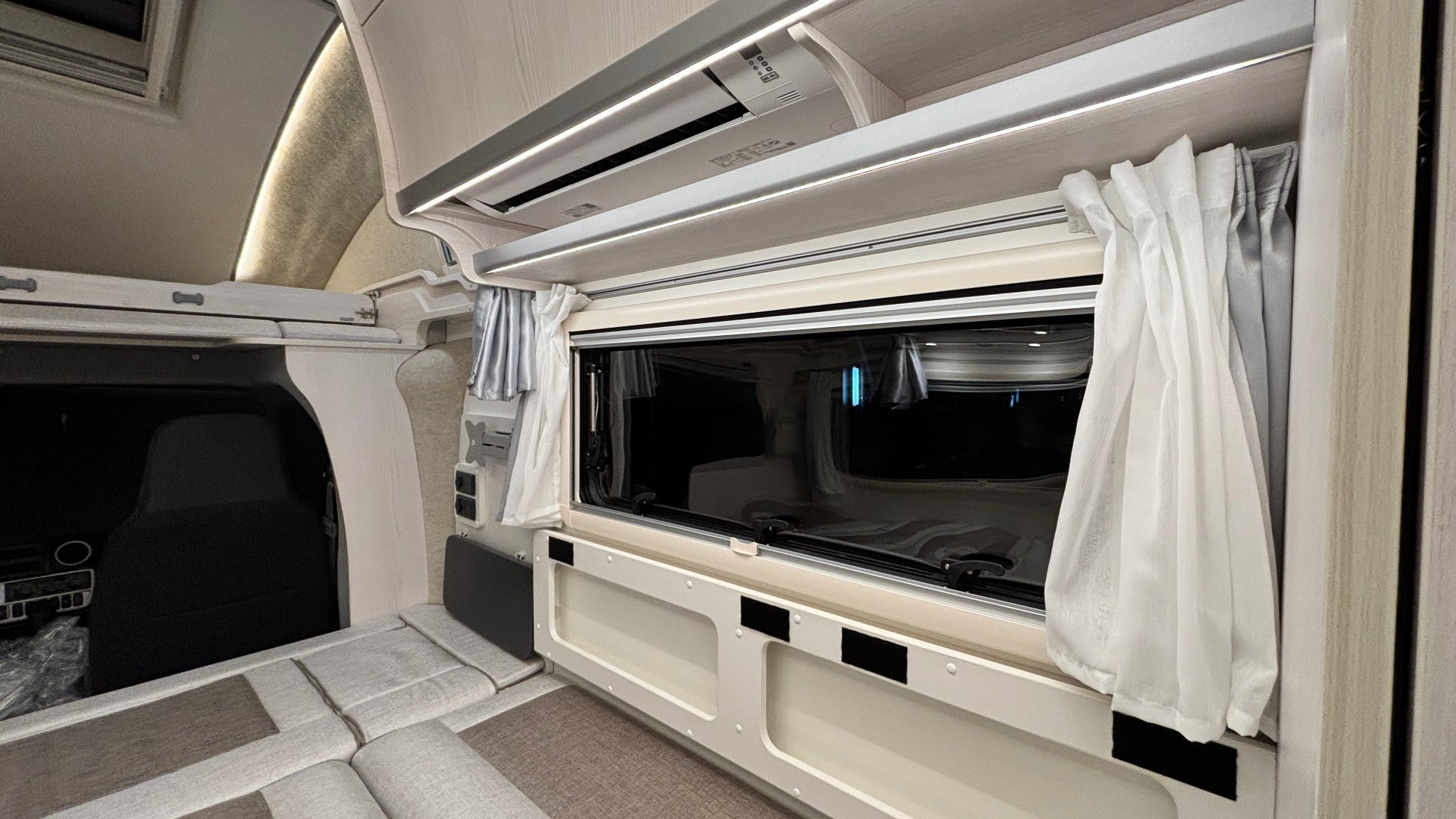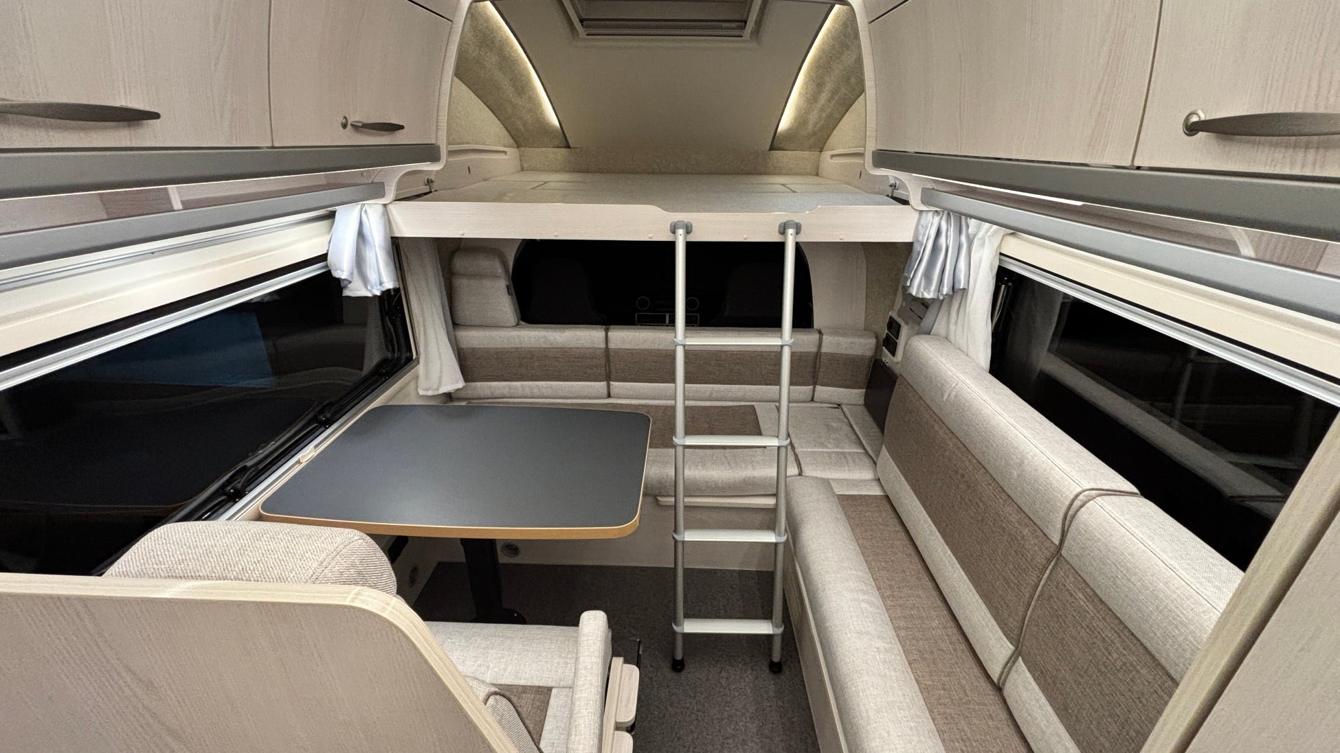 バンクベッド:長さ1940mm×幅1740mmの広々とした伸縮式バンクベッドで、大人2名が就寝可能。バンクラダー、読書灯、コンセント、間仕切りカーテンを備え、くつろぎの時間を提供します。